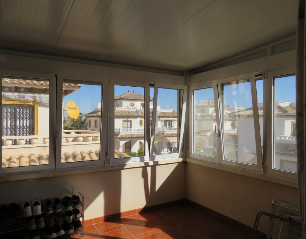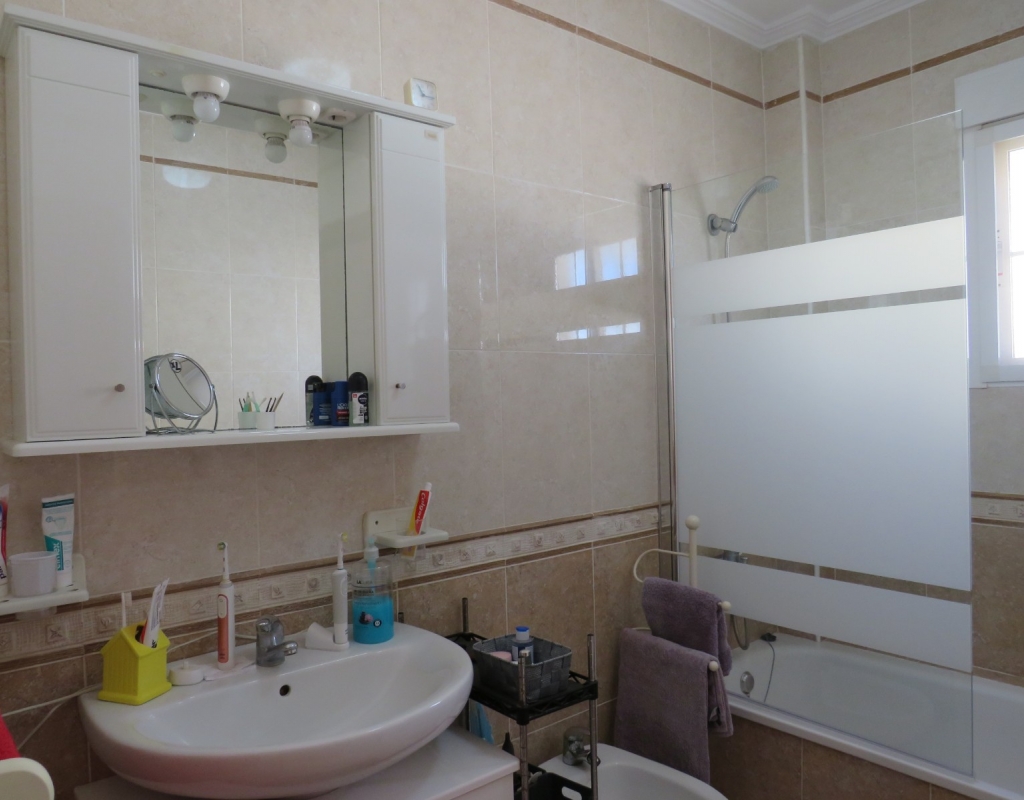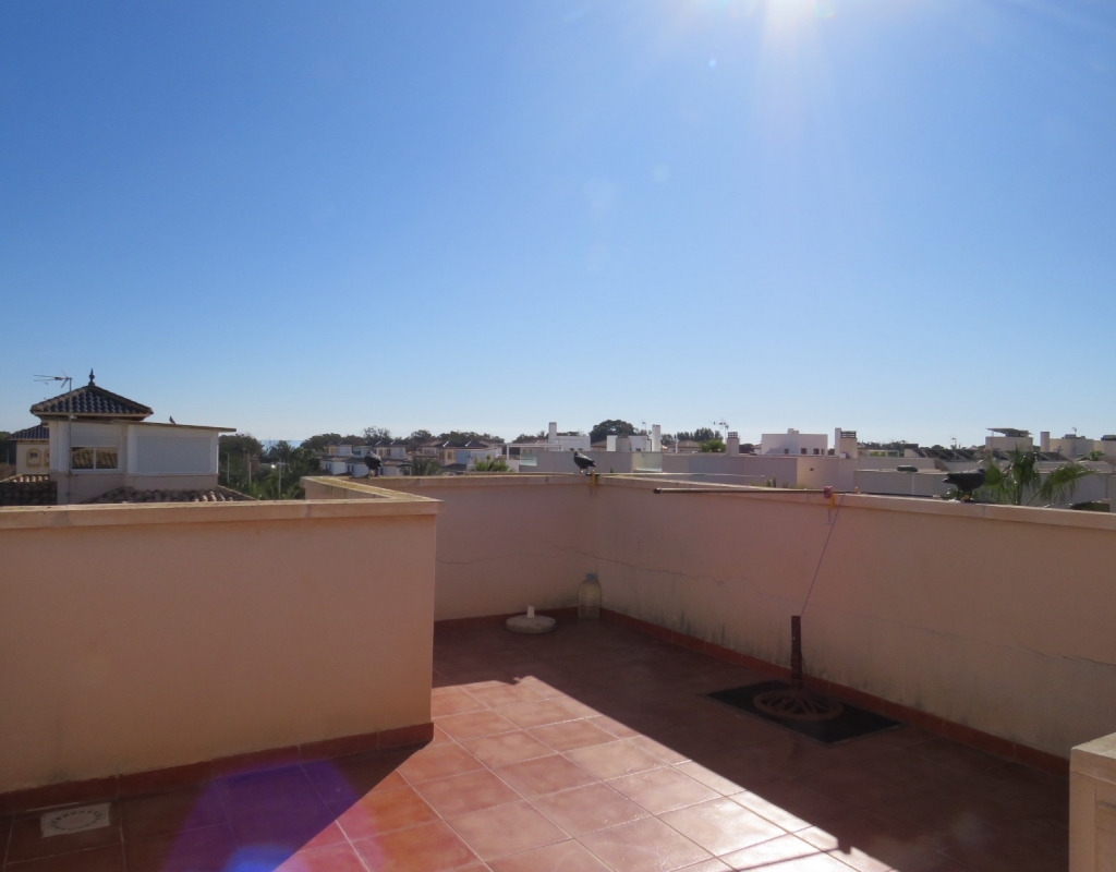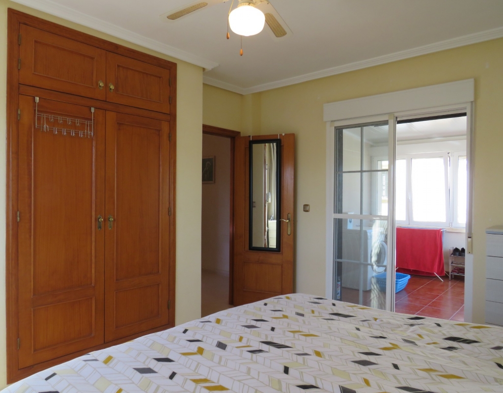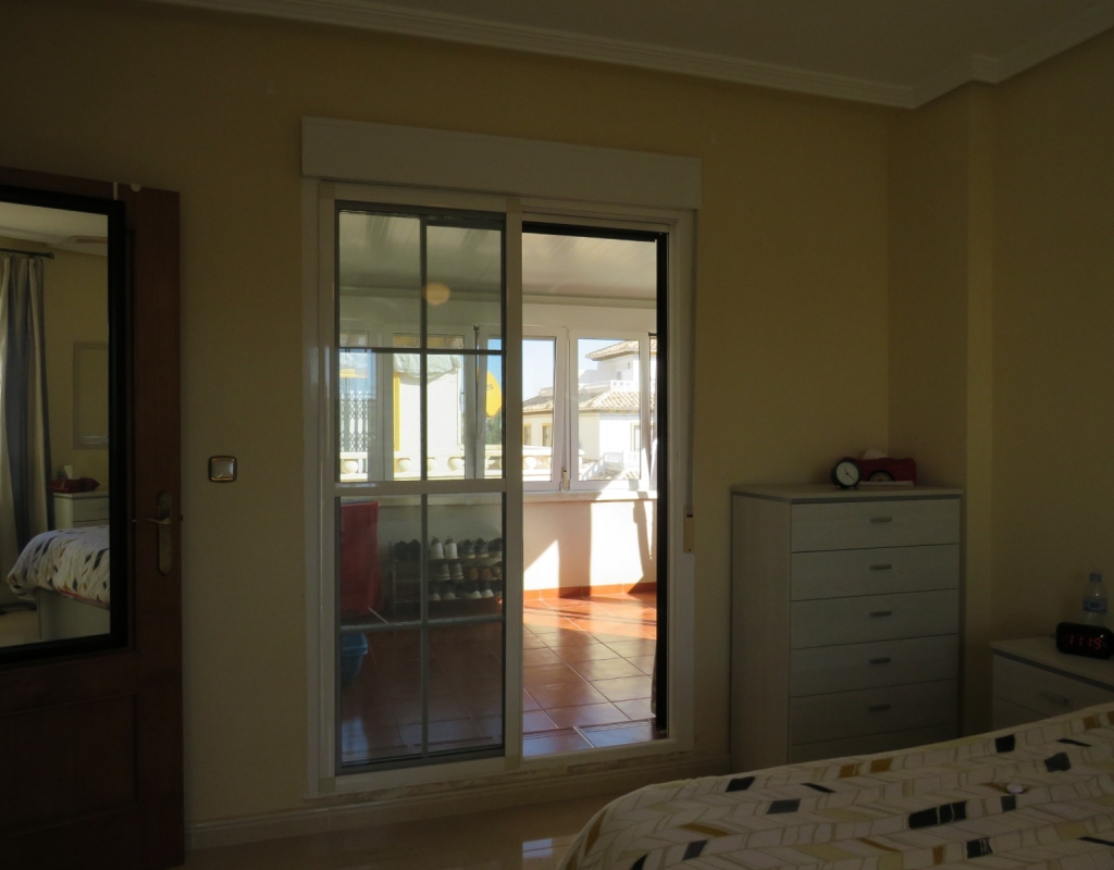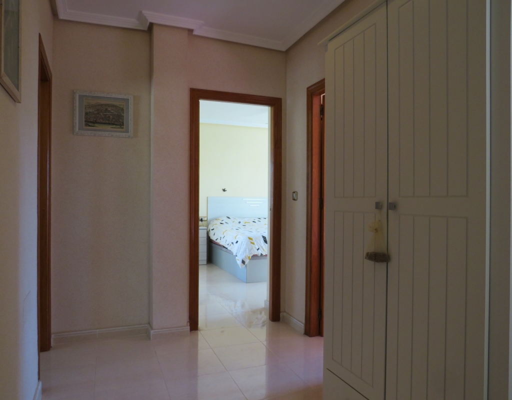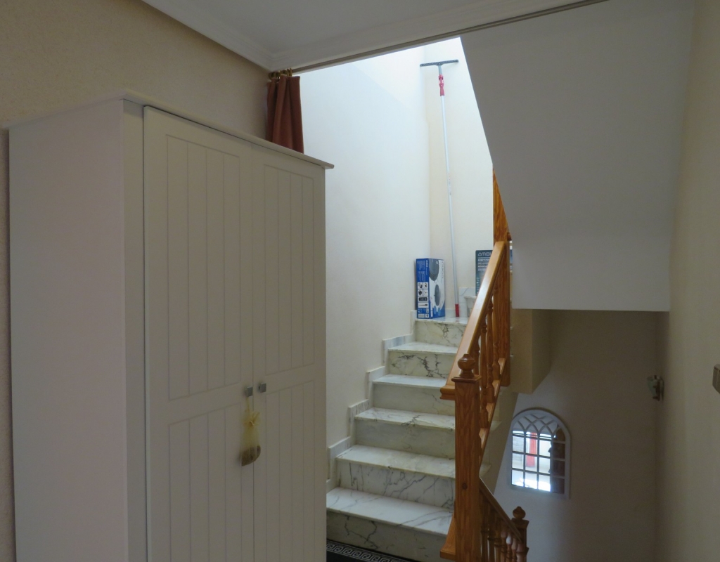 Die Marmortreppe führt Sie in die obere Etage, wo Sie das Familienbadezimmer, das zweite Schlafzimmer mit Einbauschrank und das Hauptschlafzimmer, ebenfalls mit Einbauschränken und einem verglasten Balkon, finden. Die Marmortreppe führt weiter und führt Sie zum großen privaten Solarium mit Meerblick. Das Anwesen wird möbliert verkauft und umfasst die Haushaltsgeräte. Das Anwesen verfügt über 5 Solarmodule mit einem kürzlich installierten Wechselrichter, außerdem einen Carport und die Küche wurde vor kurzem erneuert.