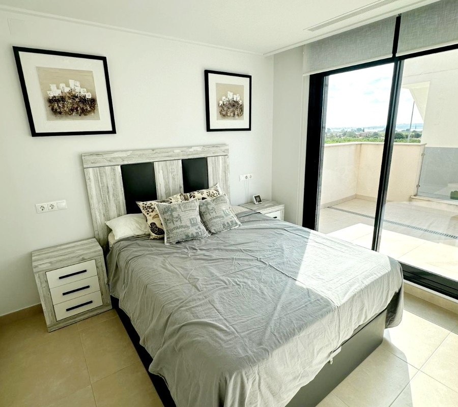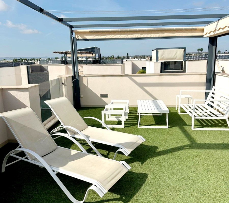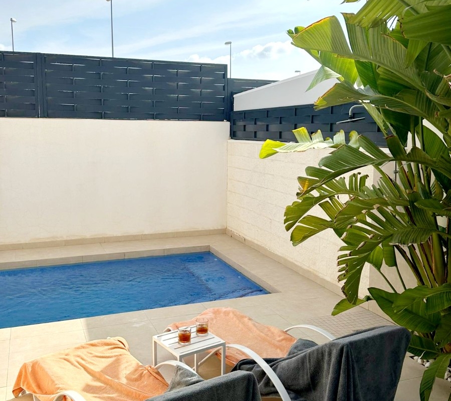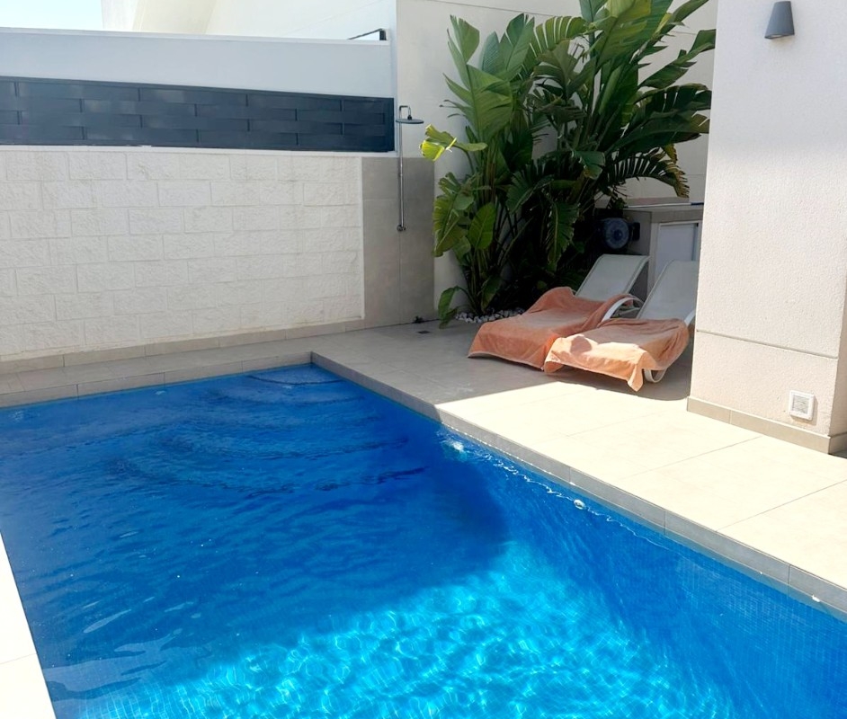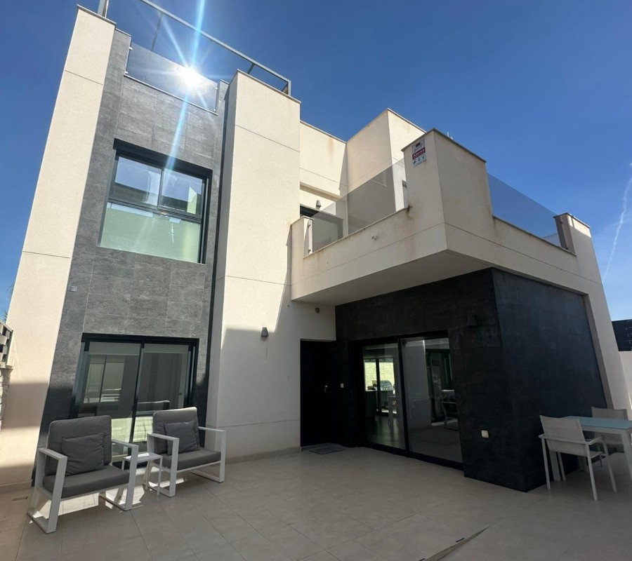 Aquí ofrecemos una villa independiente construida en 2018. La casa tiene una superficie construida de 111 m² y se encuentra en una parcela de 181 m². Encontrará una entrada cerrada con estacionamiento privado para un coche, y en la parte trasera de la propiedad encontrará una piscina con energia solar privada de 6,2 x 2,5. Al ingresar a la casa, en el nivel inferior, encontrará una sala de estar con comedor, una cocina abierta y un baño. La escalera lo lleva arriba a 3 habitaciones dobles con armarios empotrados y otro baño. También hay un gran solárium privado de unos 50 m² con vistas a las lagunas de La Mata.