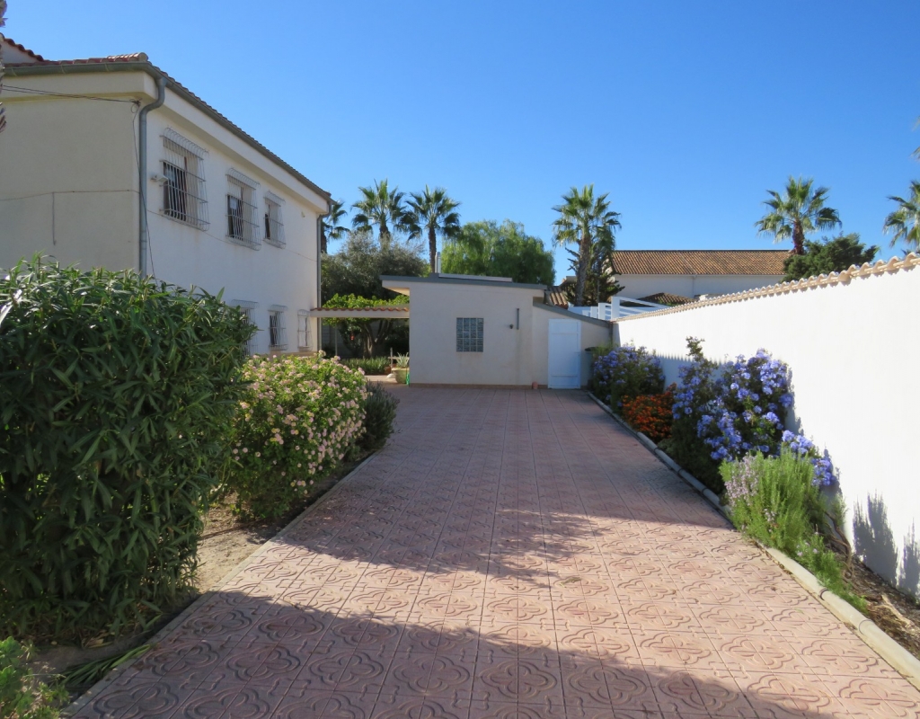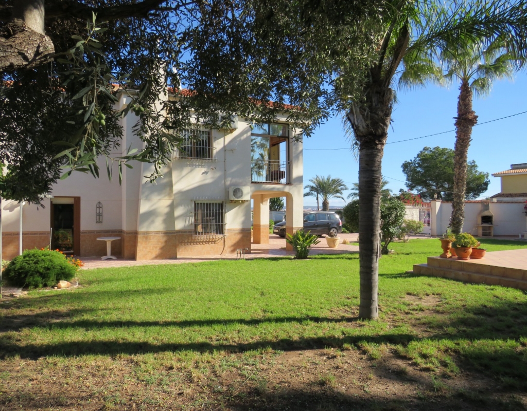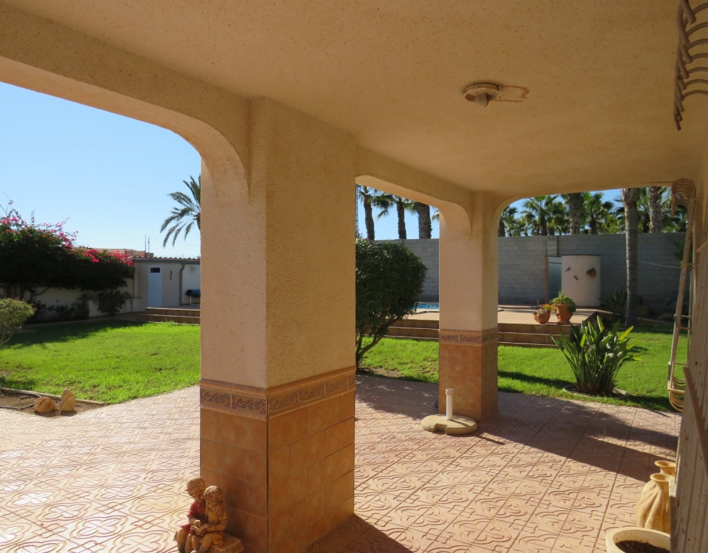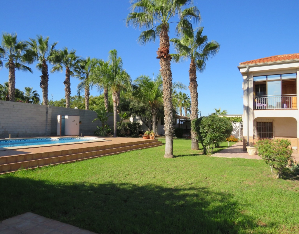 Here we have a large, independent, east facing villa for sale close to the beach and the village of La Marina, Elche, Alicante, on the South Costa Blanca.The property has a total constructed area of 403 m² which includes the house, porch, balcony, storage room, pool, parking area, utility room etc, and has a plot size of 1460 m² with two gated entrances. As you enter the electronic gated plot at the main entrance in front of the house there is private parking for several cars. At the front of the house you will find a spacious porch looking onto the beautiful garden and pool area, with different types of trees. As you enter the property you walk into a bright and spacious living room which in turn leads to a kitchen with access to the garden. Also on this floor you will find two bedrooms and a bathroom with a shower cubicle and access to a spacious garage.