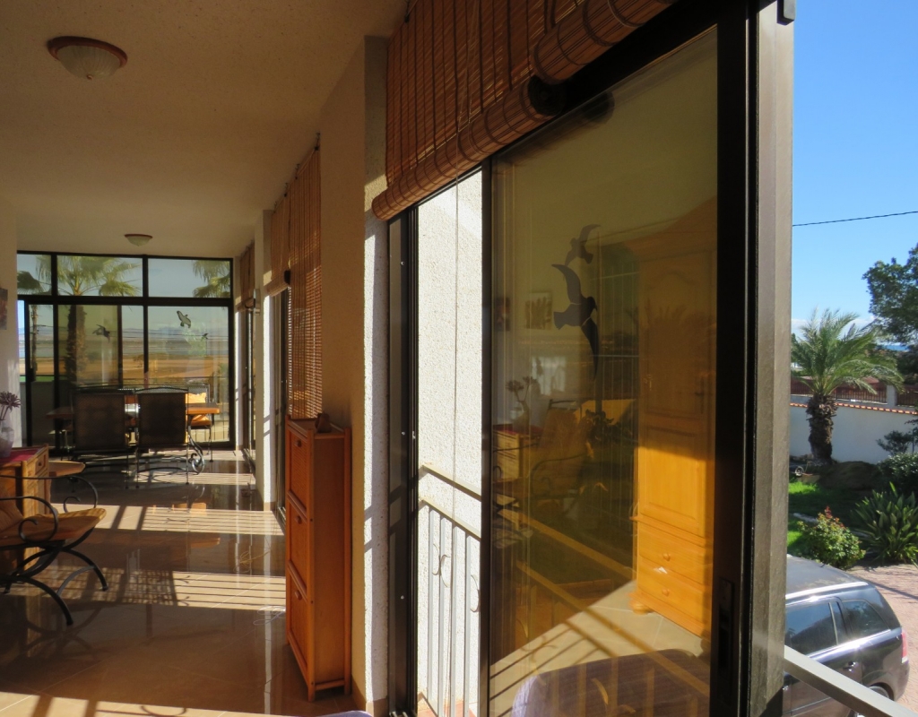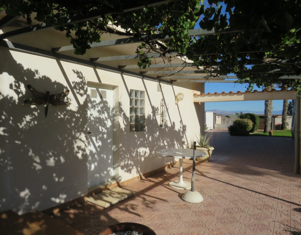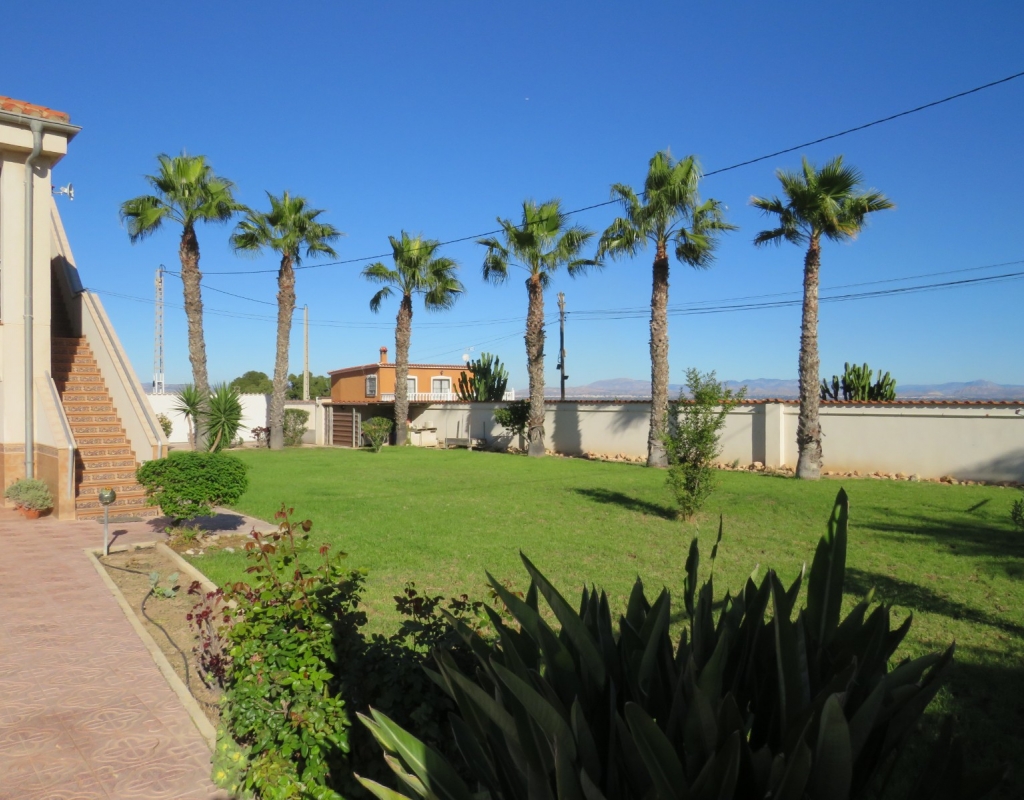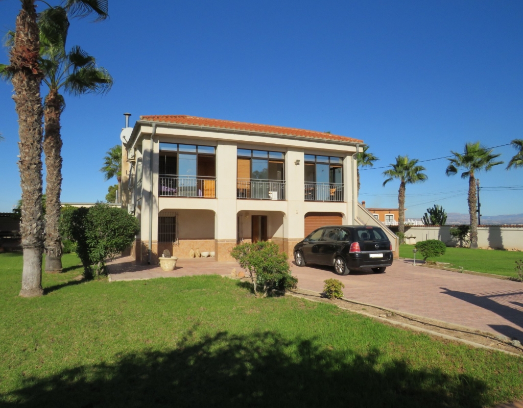 Here we have a large, independent, east facing villa for sale close to the beach and the village of La Marina, Elche, Alicante, on the South Costa Blanca.The property has a total constructed area of 403 m² which includes the house, porch, balcony, storage room, pool, parking area, utility room etc, and has a plot size of 1460 m² with two gated entrances. As you enter the electronic gated plot at the main entrance in front of the house there is private parking for several cars. At the front of the house you will find a spacious porch looking onto the beautiful garden and pool area, with different types of trees. As you enter the property you walk into a bright and spacious living room which in turn leads to a kitchen with access to the garden. Also on this floor you will find two bedrooms and a bathroom with a shower cubicle and access to a spacious garage.