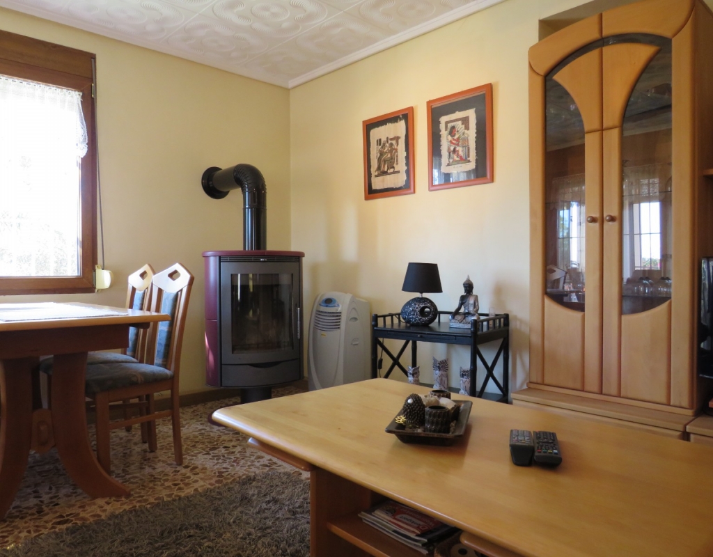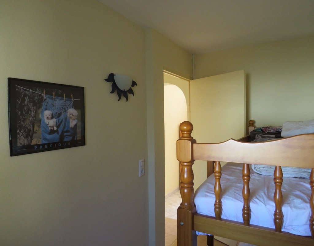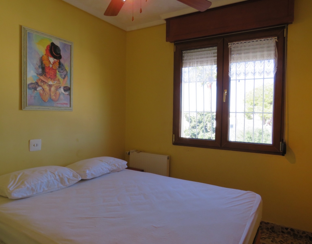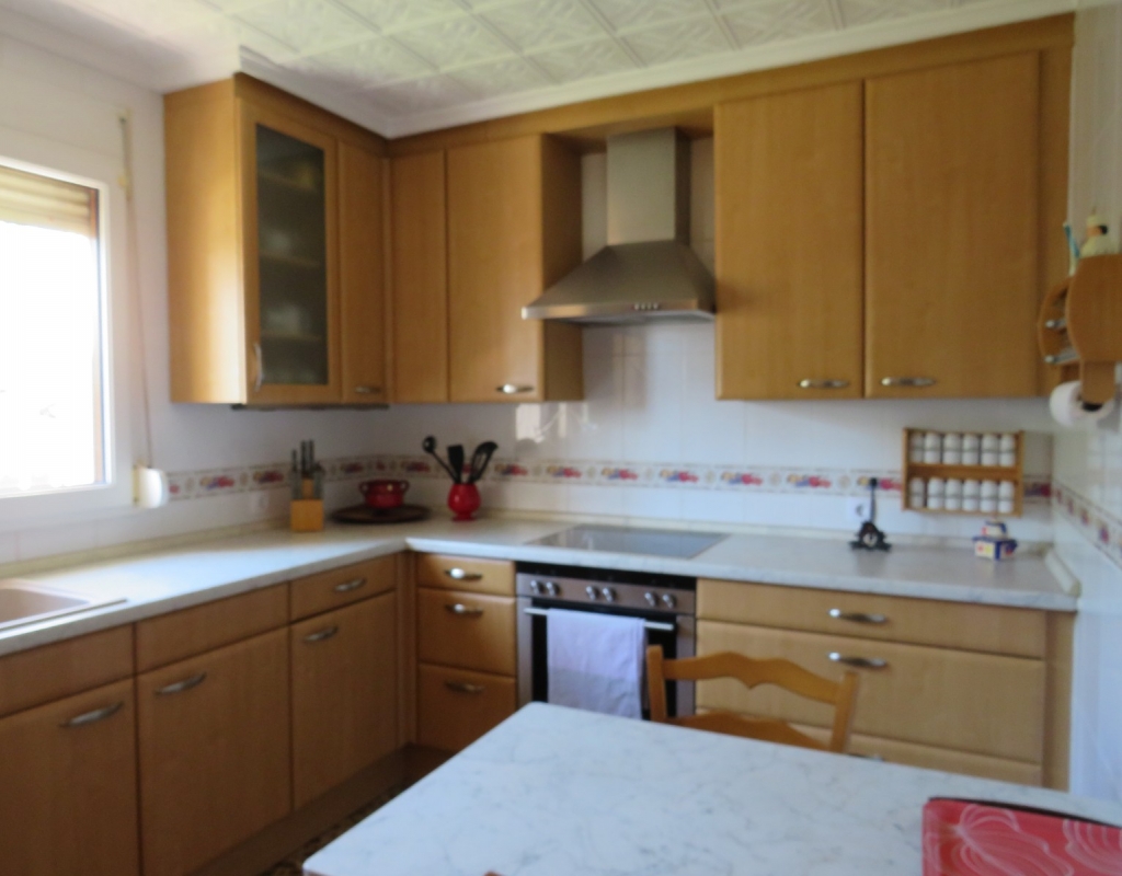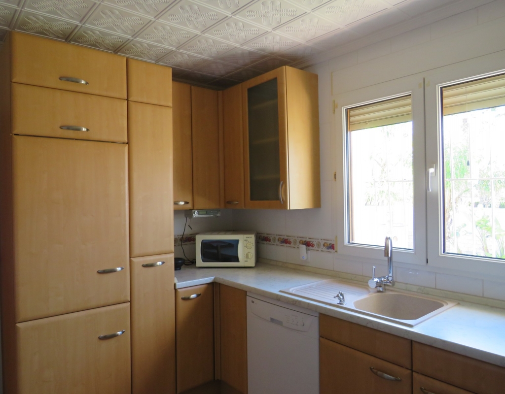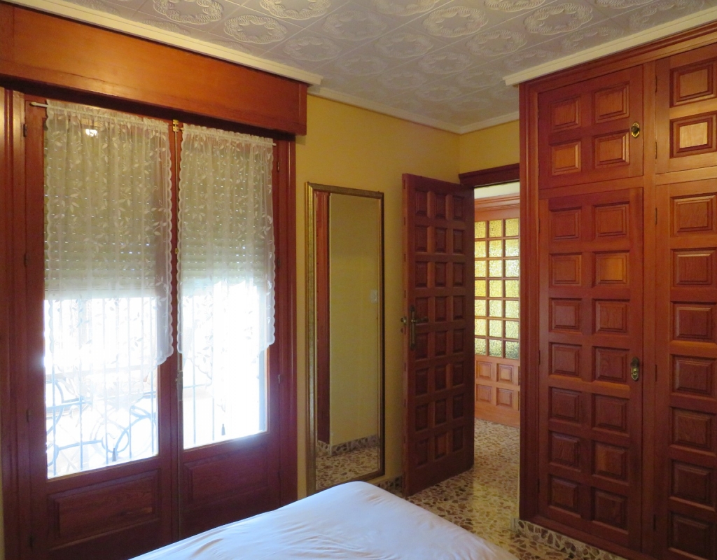 The staircase at the side of the house leads you upstairs where you will find a spacious glazed balcony with views of the garden and pool area and sea views across to Santa Pola. Also here you will find the entrance to the second living area which consists of a large living room with a pellet burner, also you will find a large kitchen, a bathroom, and 3 bedrooms. The external staircase also leads you up to a large private solarium with panoramic and sea views. Behind the house you will find a large storage space for bikes etc and there is also a big utility room which also houses the oil fired central heating. There are two one bedroom one bathroom granny flats for those extra guests and below these two rooms is a large cellar/basement.