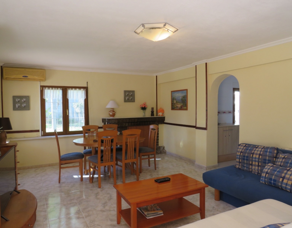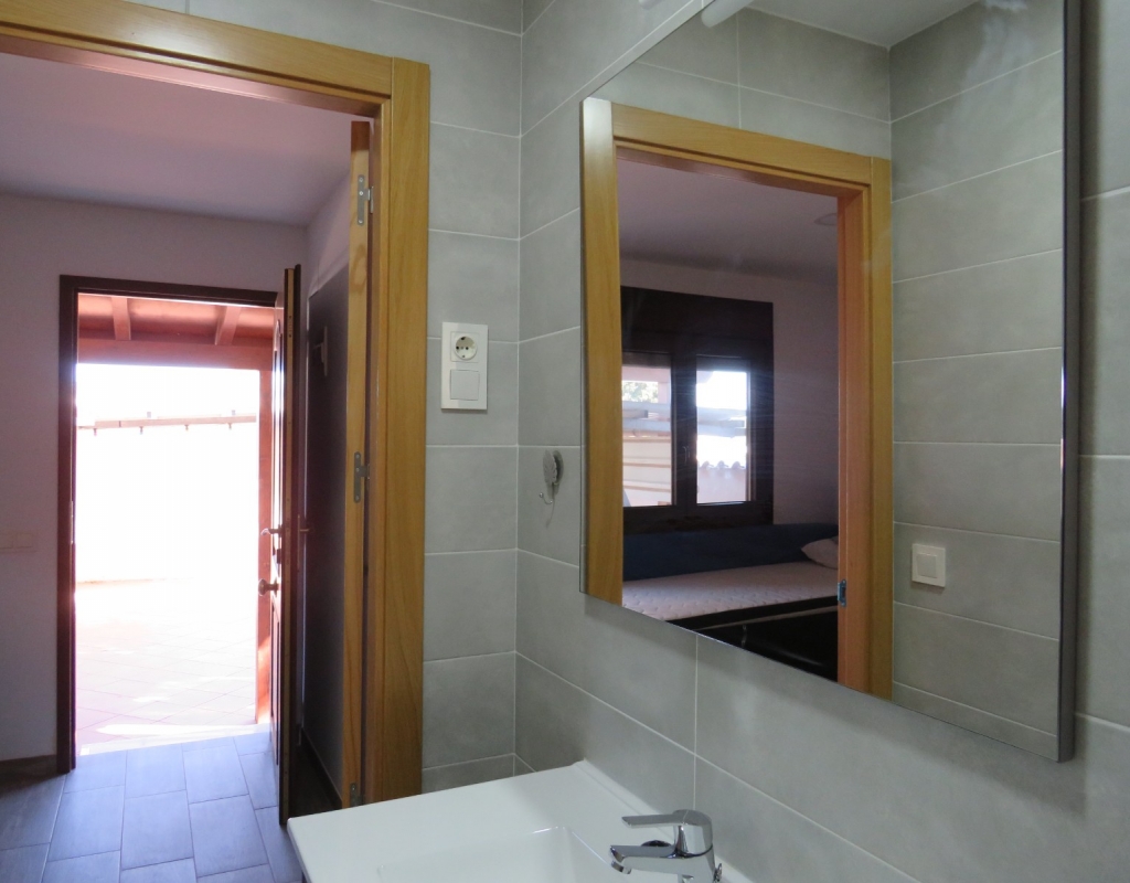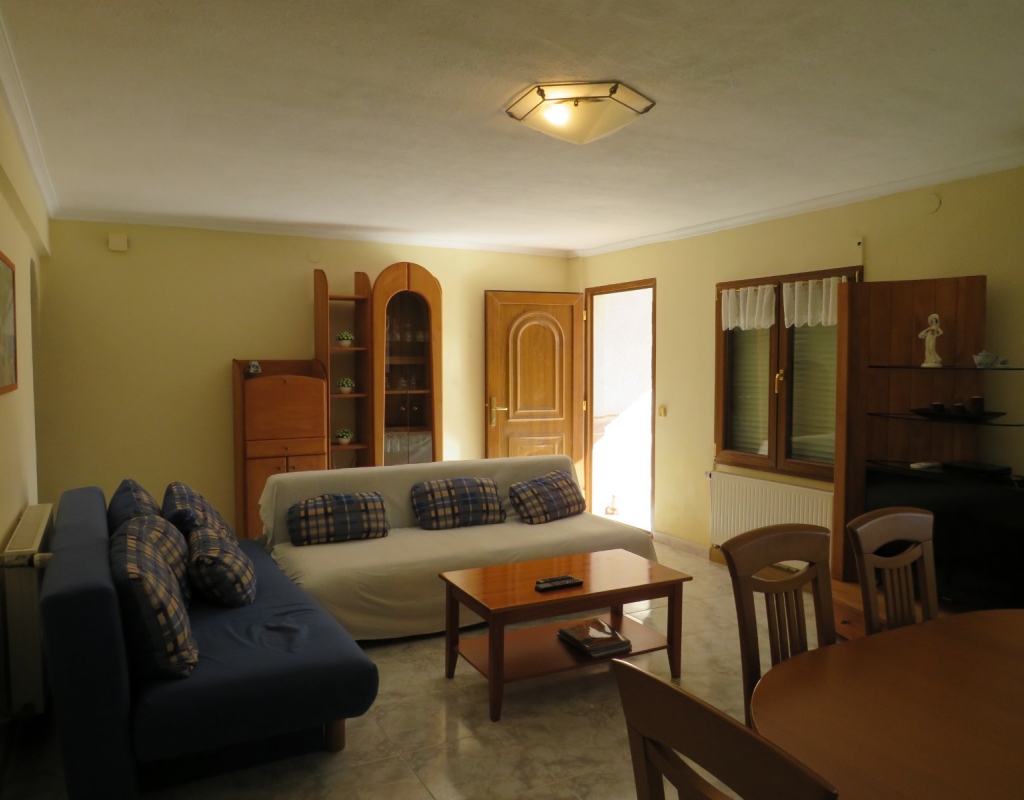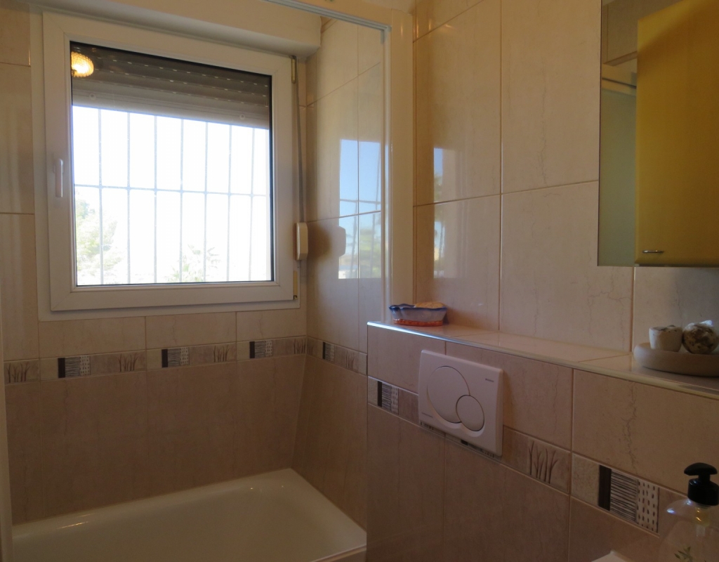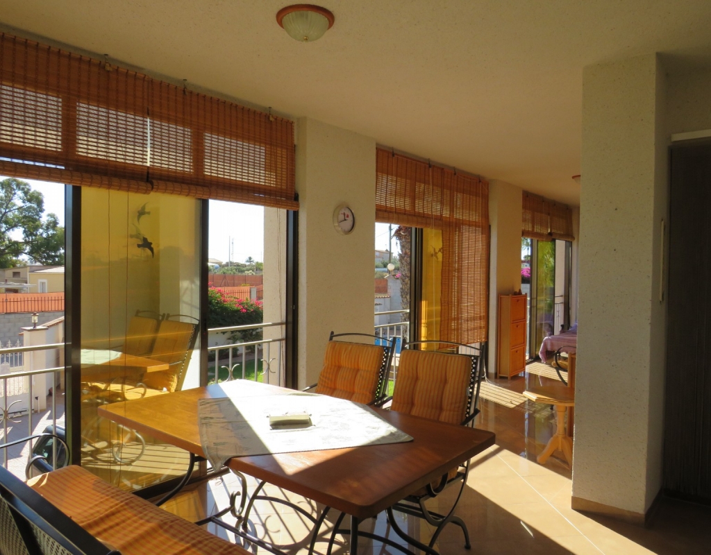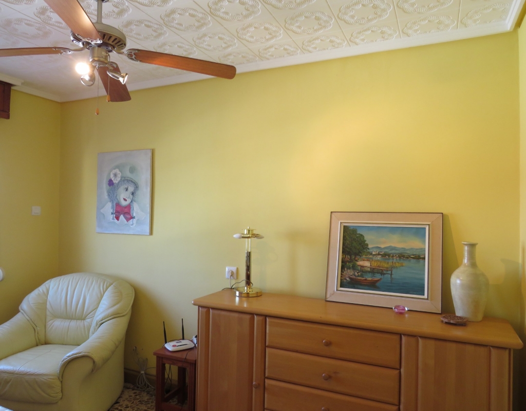 The staircase at the side of the house leads you upstairs where you will find a spacious glazed balcony with views of the garden and pool area and sea views across to Santa Pola. Also here you will find the entrance to the second living area which consists of a large living room with a pellet burner, also you will find a large kitchen, a bathroom, and 3 bedrooms. The external staircase also leads you up to a large private solarium with panoramic and sea views. Behind the house you will find a large storage space for bikes etc and there is also a big utility room which also houses the oil fired central heating. There are two one bedroom one bathroom granny flats for those extra guests and below these two rooms is a large cellar/basement.