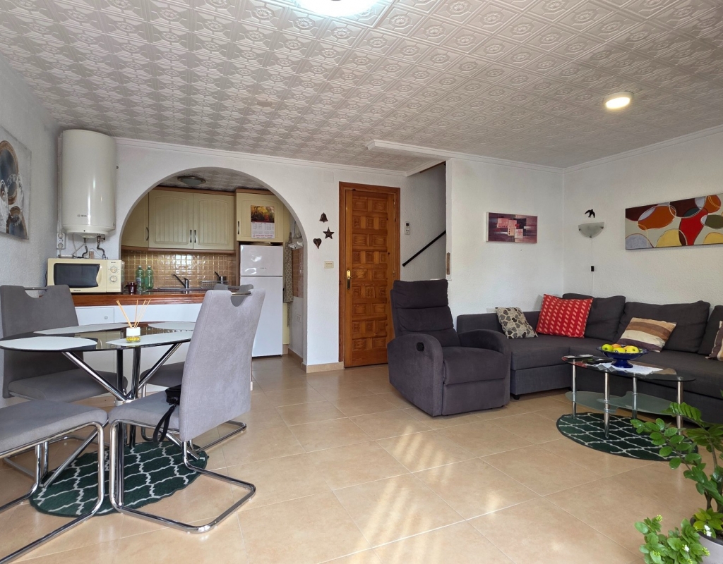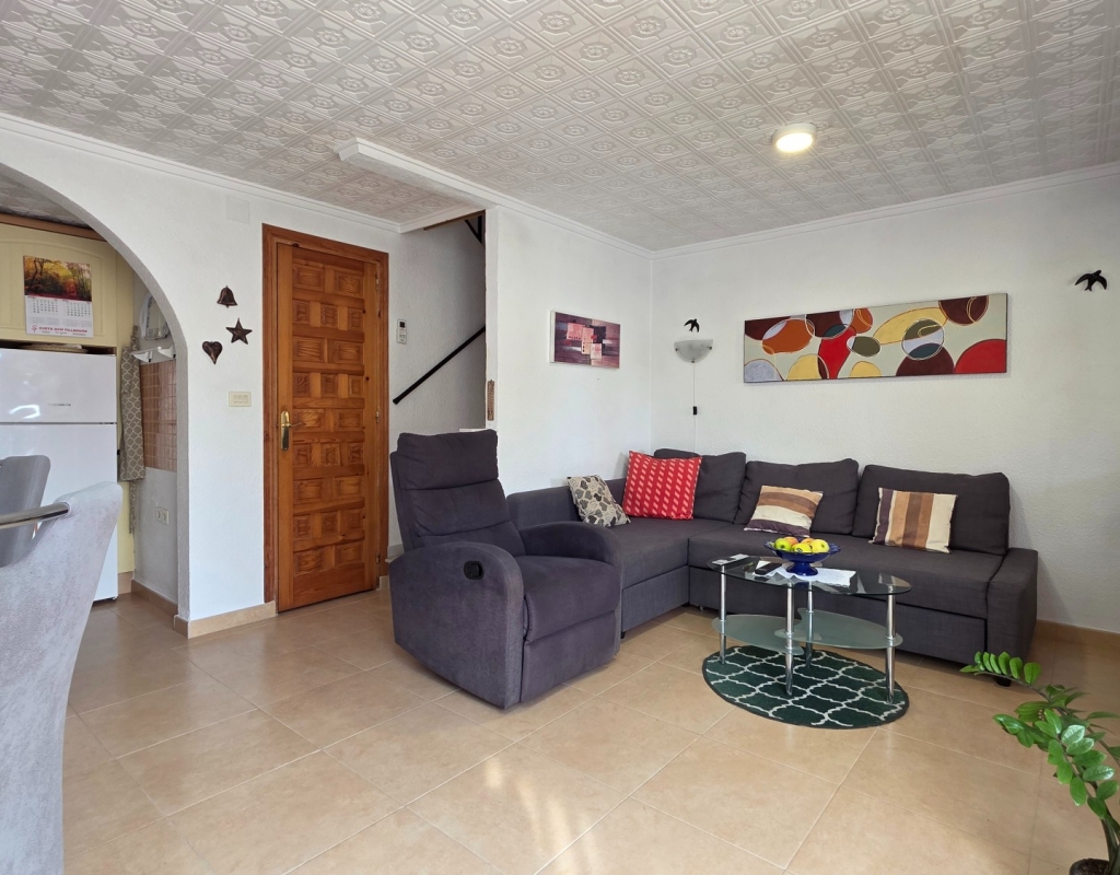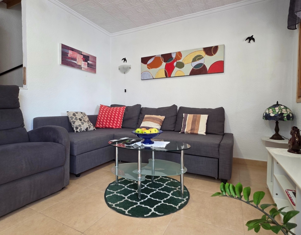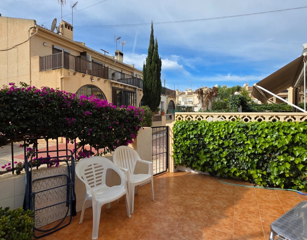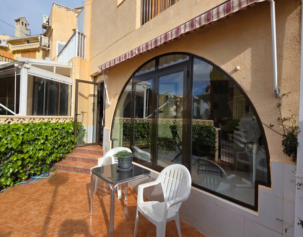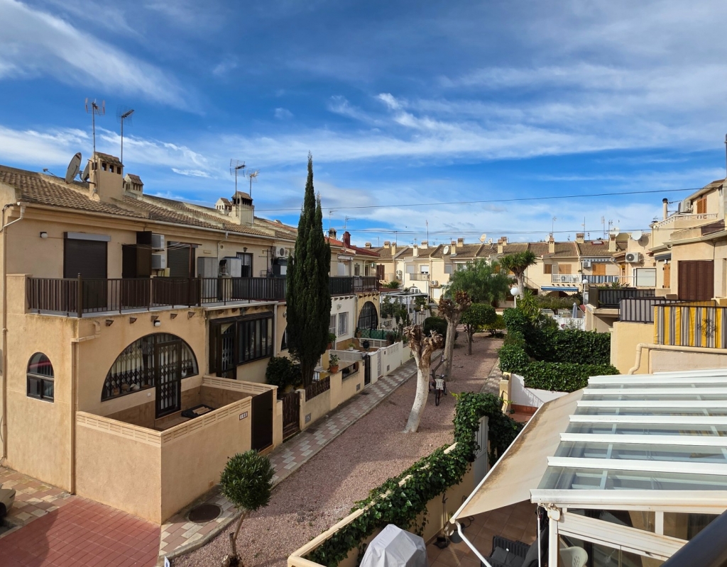 Here we have a lovely south facing, 2 bedroom terraced house for sale in the popular area of Buenavista, Guardamar del Segura, Alicante on the South Costa Blanca and only six hundred metres from the beach. The property has a constructed area of around 60 m² on two levels and on the outside you will find a sunny and spacious terrace lower terrace, a few steps up takes you to the main door of the house and on the right, as you enter you have another door where you enter the glazed porch/conservatory area. Inside you will find a spacious living room, an open plan kitchen and a half bathroom. The marble staircase leads you upstairs where you will find the family bathroom, and two double bedrooms with the master having access to sunny spacious balcony with views to Guardamar and the pine Forrest.