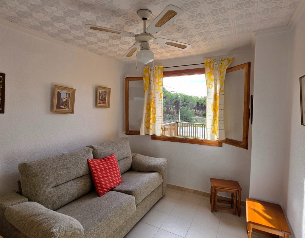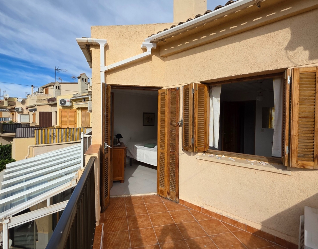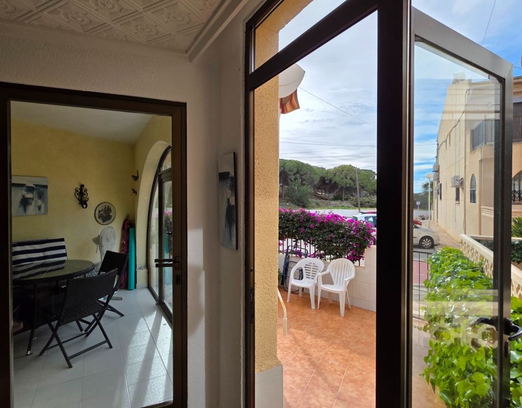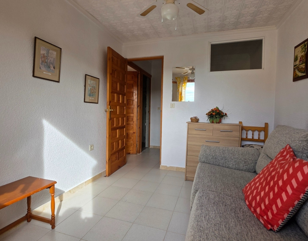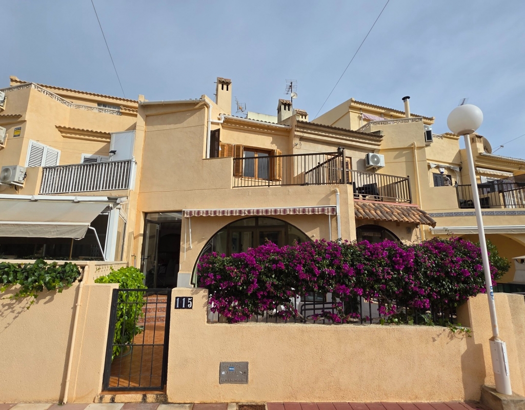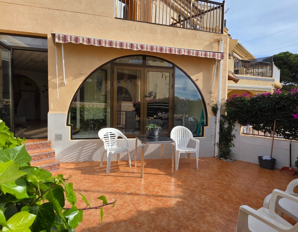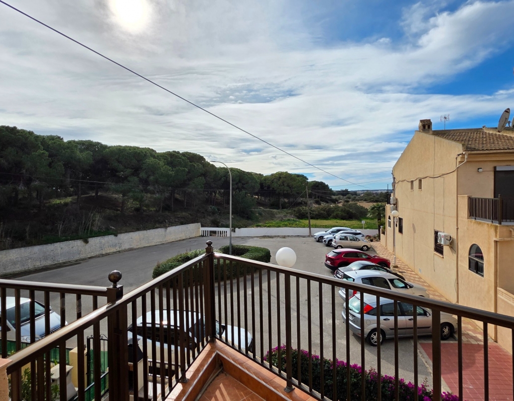 Here we have a lovely south facing, 2 bedroom terraced house for sale in the popular area of Buenavista, Guardamar del Segura, Alicante on the South Costa Blanca and only six hundred metres from the beach. The property has a constructed area of around 60 m² on two levels and on the outside you will find a sunny and spacious terrace lower terrace, a few steps up takes you to the main door of the house and on the right, as you enter you have another door where you enter the glazed porch/conservatory area. Inside you will find a spacious living room, an open plan kitchen and a half bathroom. The marble staircase leads you upstairs where you will find the family bathroom, and two double bedrooms with the master having access to sunny spacious balcony with views to Guardamar and the pine Forrest.