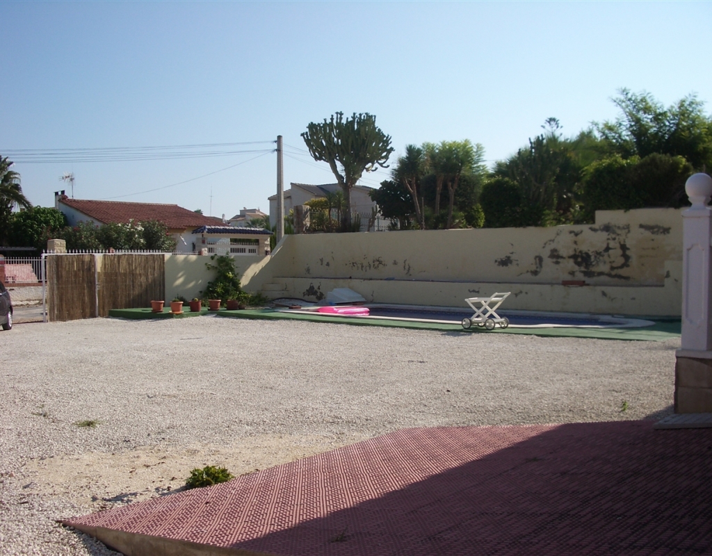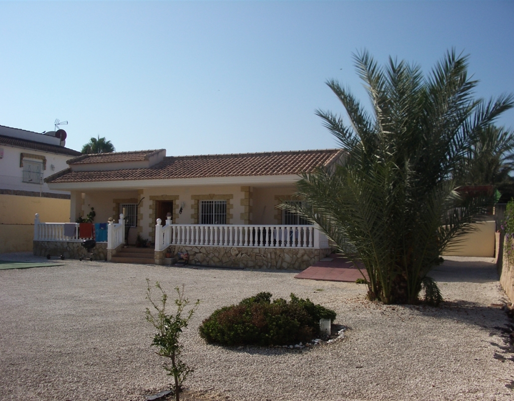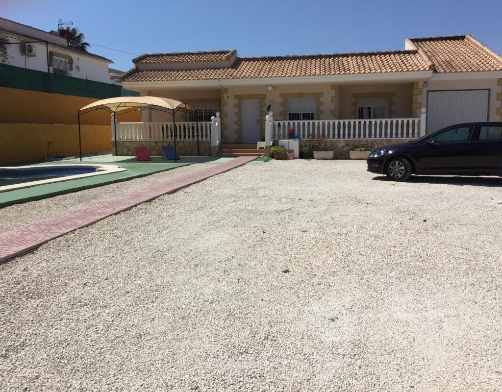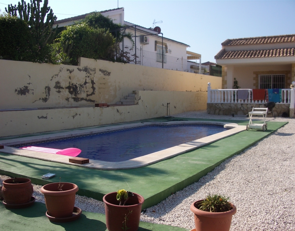 Villa zu verkaufen in El Oasis, La Marina Urbanisation. Das Anwesen verfügt über ein Grundstück von 1030 m ² und eine Wohnfläche von 220 m², in dem über 3 Schlafzimmer, 2 Bäder, ein großes Wohnzimmer und ein Esszimmer / Büro, das auch als weiteres Schlafzimmer genutzt werden könnte befinden. Es gibt auch eine Küche, Garage, privater Parkplatz, Terrasse, Terrasse und große Sonnenterrasse mit herrlicher Aussicht, und einen privaten Pool.