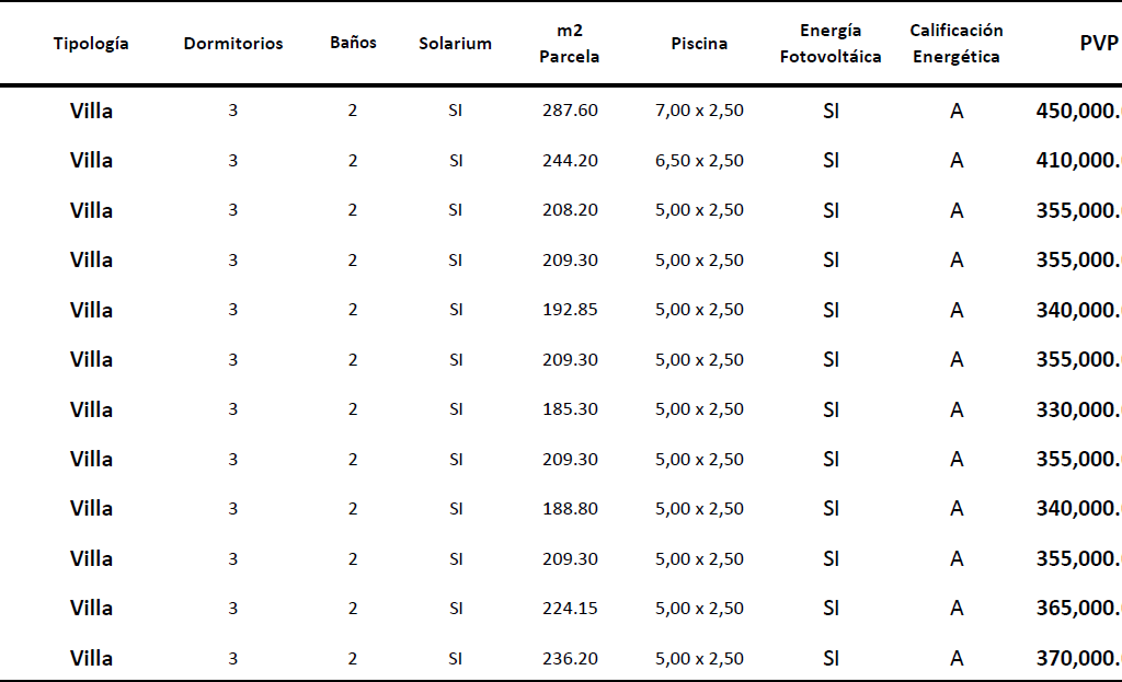 Es stehen 12 Villen mit unterschiedlichen Grundstücksgrößen und Verkaufspreisen zum Verkauf. Die kleinste Grundstücksgröße beträgt 188.8 m² bei einem Verkaufspreis von 340.000 €, die größte Grundstücksgröße beträgt 236.2 m² bei einem Verkaufspreis von 365.000 €.