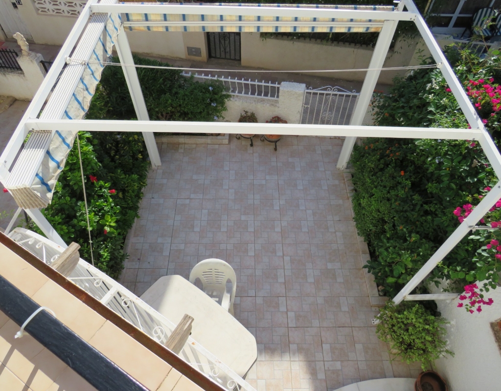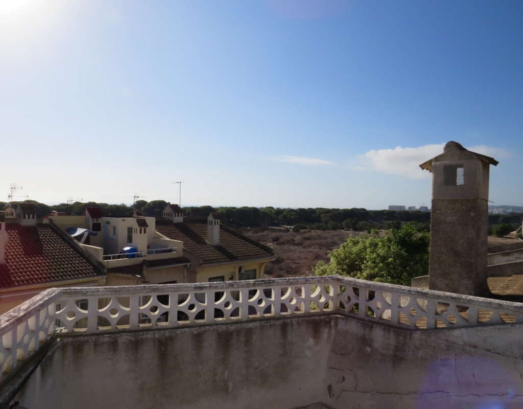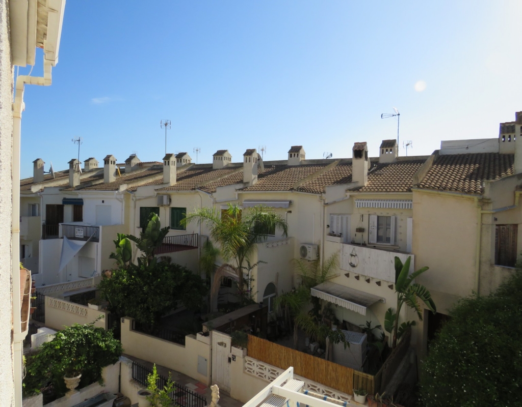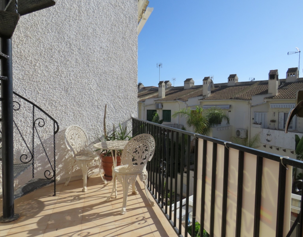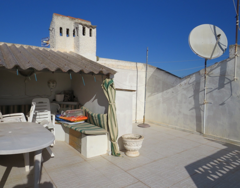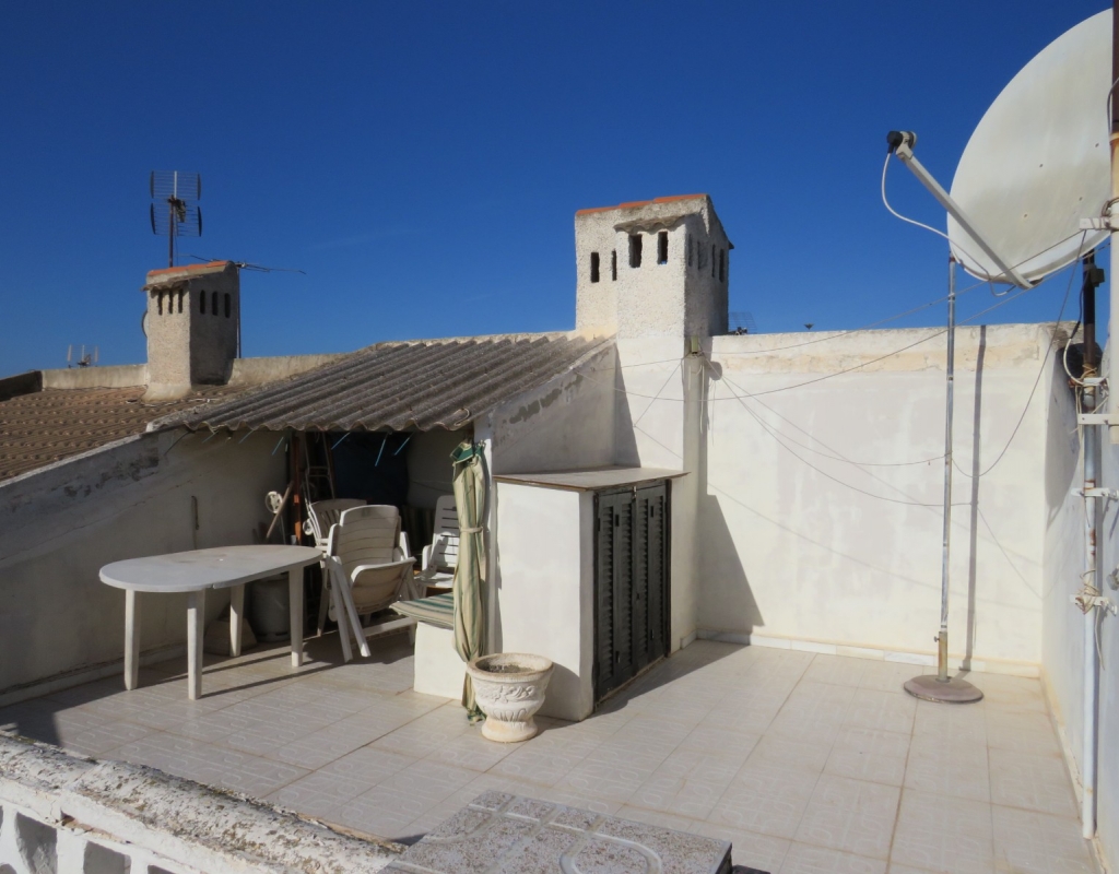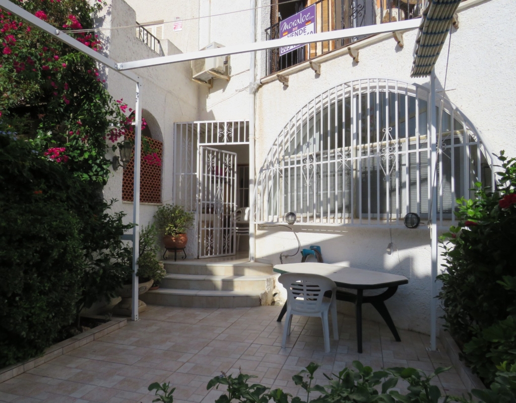 Wir sind stolz, dieses nach Osten ausgerichtete Reihenmittelhaus in der schönen Gegend von Buenavista, Guardamar und nur 600 Meter vom Strand entfernt zum Verkauf anbieten zu können. Das Anwesen hat eine bebaute Fläche von rund 60 m² auf zwei Ebenen. Draußen finden Sie eine untere Terrasse, ein paar Stufen hinauf gelangen Sie zu einem eingezäunten Verandabereich. Im Inneren finden Sie ein geräumiges und erweitertes Wohnzimmer, einen Essbereich, eine offene Küche und ein Gäste-WC. Die Marmortreppe führt Sie nach oben, wo Sie einen geräumigen Abstellraum, das Familienbadezimmer und zwei Doppelschlafzimmer finden, wobei beide Schlafzimmer Zugang zu einem sonnigen, geräumigen Balkon haben. Eine Wendeltreppe führt zu einem großen privaten Solarium mit Blick auf das Meer und nach Guardamar.