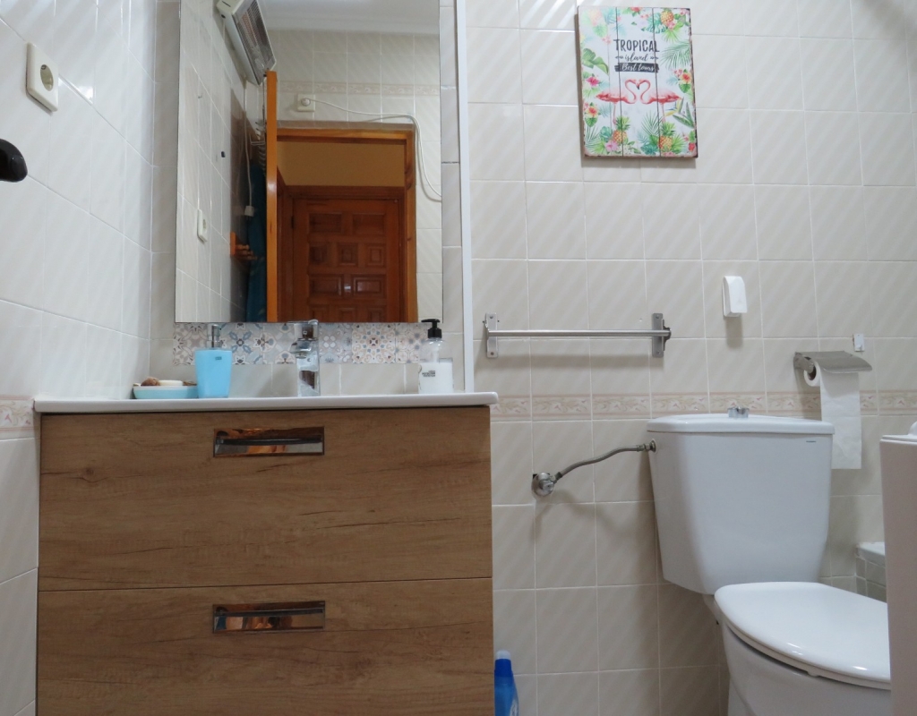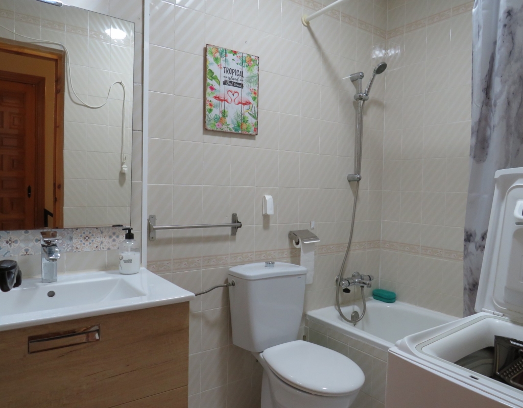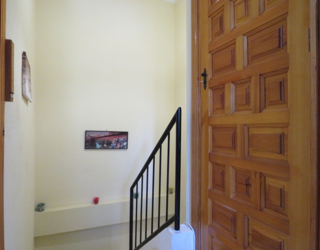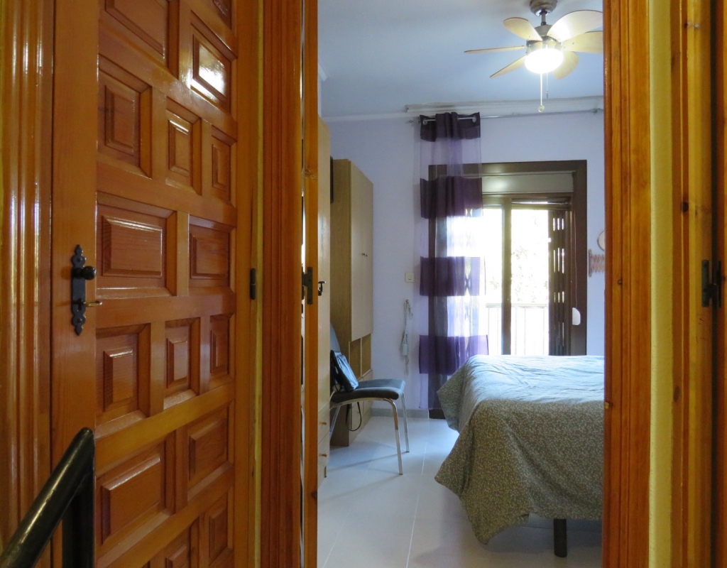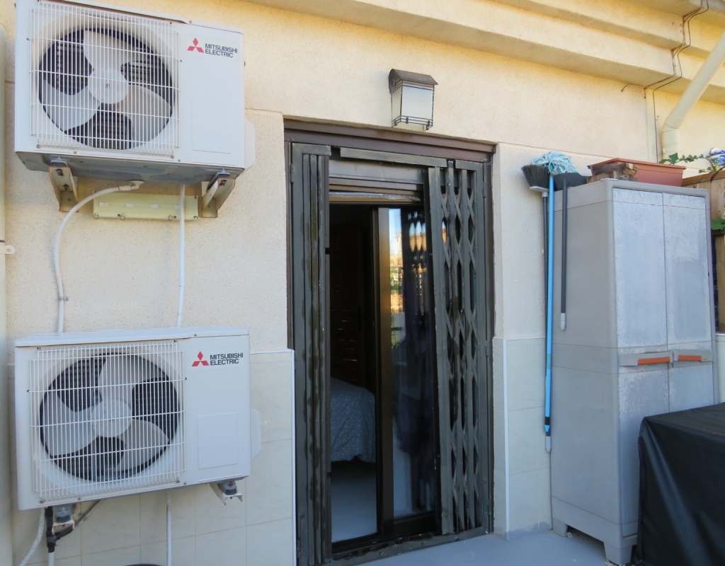 Wir sind stolz, Ihnen dieses schöne Reihenmittelhaus mit einem Schlafzimmer in der schönen Urbanisation Buenavista, Guardamar, nur 600 Meter vom Strand entfernt, zum Verkauf anbieten zu können. Das Anwesen hat eine bebaute Fläche von ca. 48 m² und im Erdgeschoss finden Sie eine Terrasse, eine verglaste Veranda, die als Essbereich genutzt wird, ein Wohnzimmer mit Kamin und eine offene Küche. Die Marmortreppe führt Sie in die obere Etage, wo Sie ein weiteres kleines Abstellzimmer, das Familienbadezimmer mit Badewanne und Dusche, das Doppelschlafzimmer mit Kleiderschränken und Doppeltüren aus Aluminium mit einem Sicherheitstor finden, das zu einem Balkon mit grünem und freiem Blick führt. Im Wohnzimmer und im Schlafzimmer gibt es Klimaanlagen (warm und kalt).