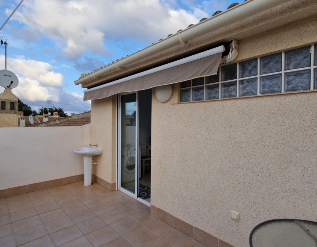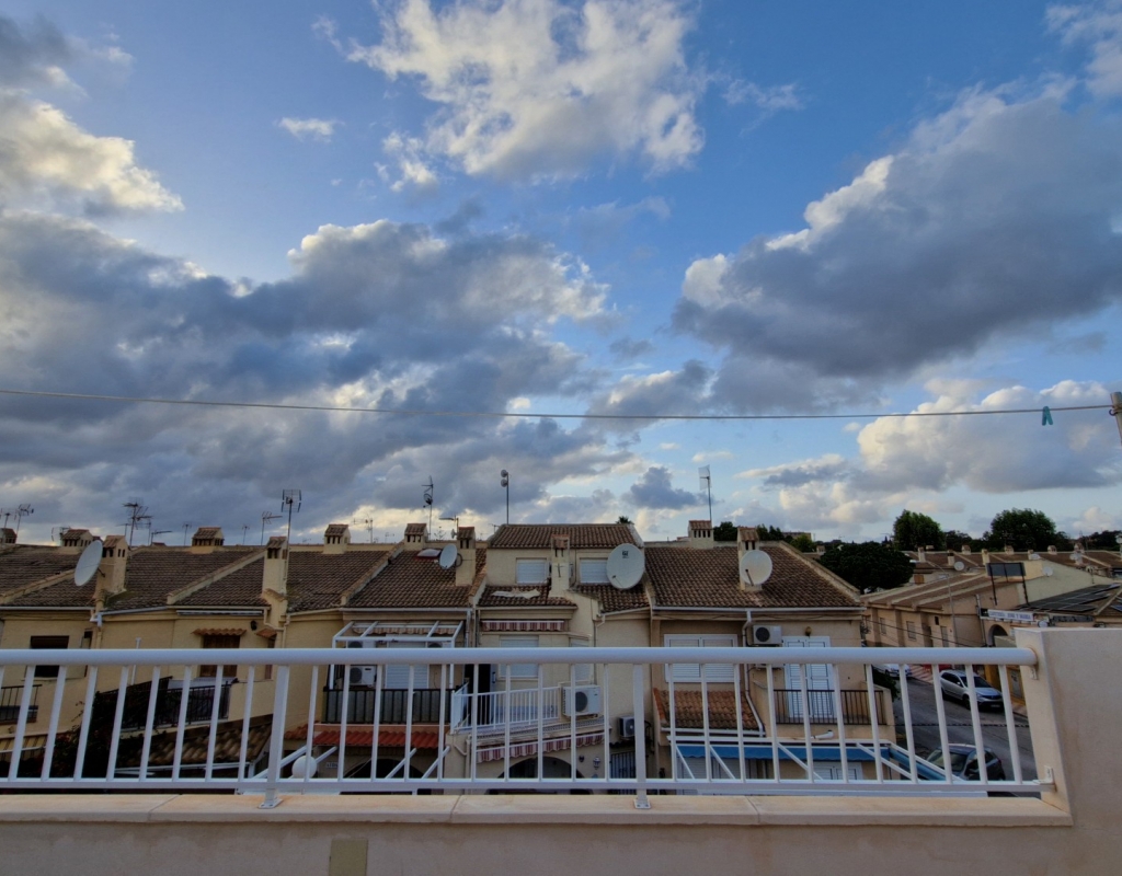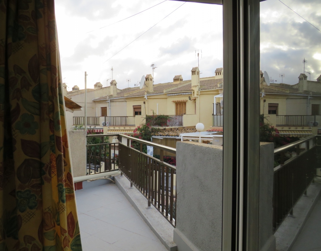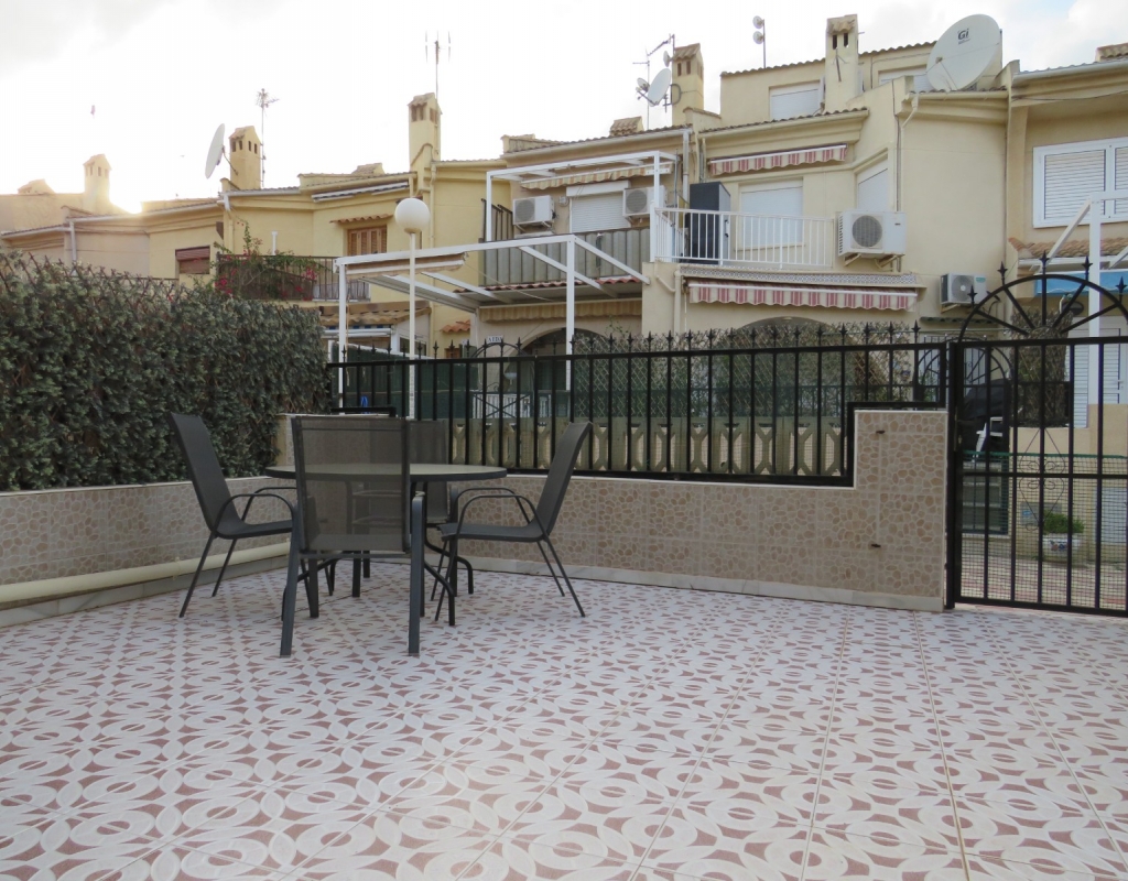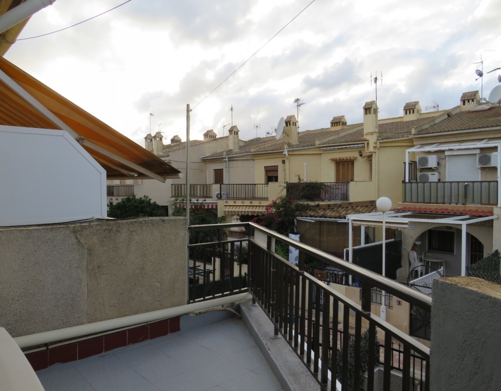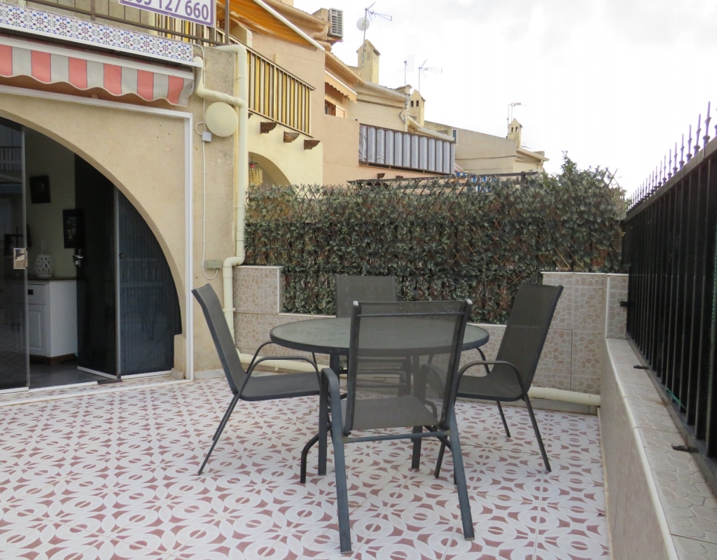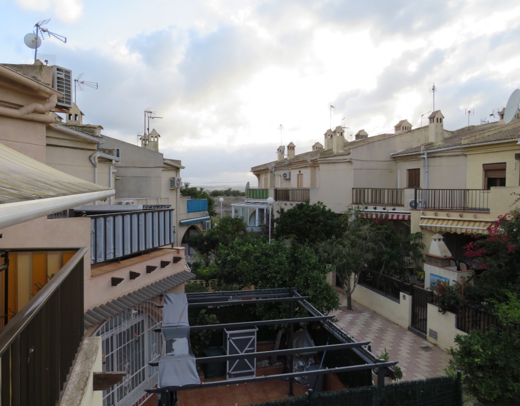 Wir sind stolz, dieses nach Westen ausgerichtete, modern eingerichtete Reihenhaus in der schönen Gegend von Buenavista, Guardamar und nur 600 Meter vom Strand entfernt zum Verkauf anbieten zu können. Das Anwesen hat eine bebaute Fläche von rund 80 m² auf drei Ebenen. Im Außenbereich finden Sie eine geräumige Terrasse mit Schuppen. Wenn Sie durch die Glasvorhänge treten, finden Sie ein geräumiges und renoviertes Wohnzimmer, eine offene, moderne Küche und ein Gäste-WC. Die Marmortreppe führt Sie nach oben, wo Sie das moderne Familienbadezimmer mit ebenerdiger Dusche und zwei Doppelschlafzimmer finden, von denen das Hauptschlafzimmer Zugang zu einem sonnigen, geräumigen Balkon hat. Eine weitere Treppe führt Sie zum Solarium, hier finden Sie einen Raum mit der Waschmaschine und dem Warmwasserbereiter sowie Doppelschiebetüren zum geräumigen privaten Solarium mit Blick auf Guardamar.