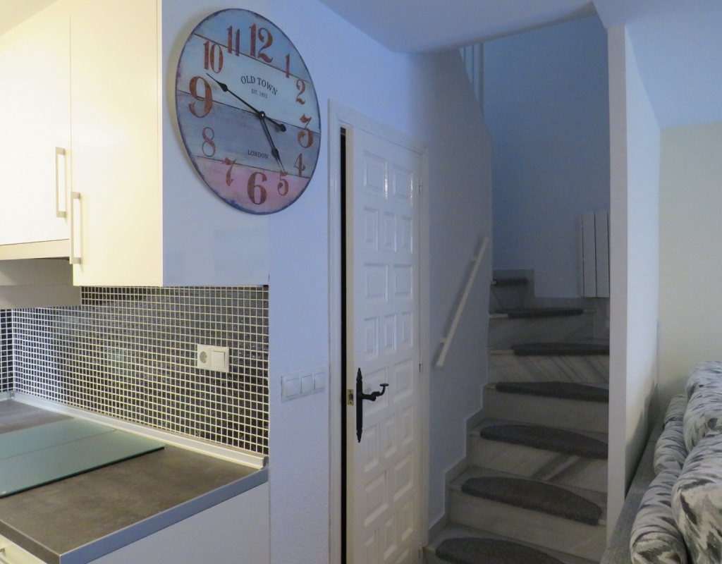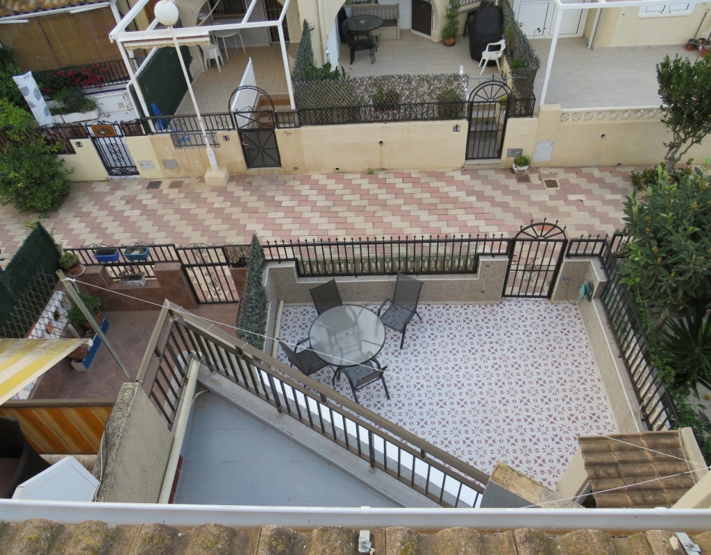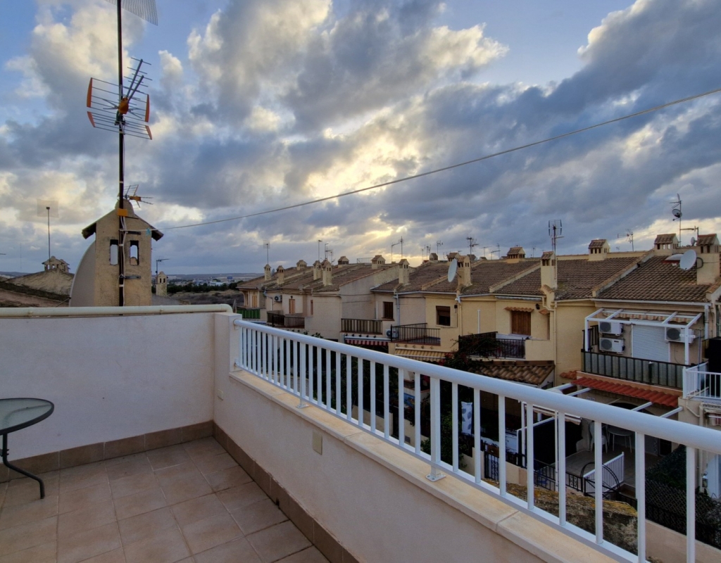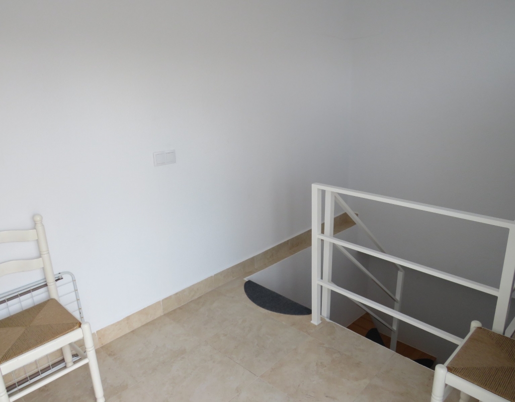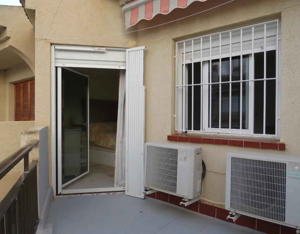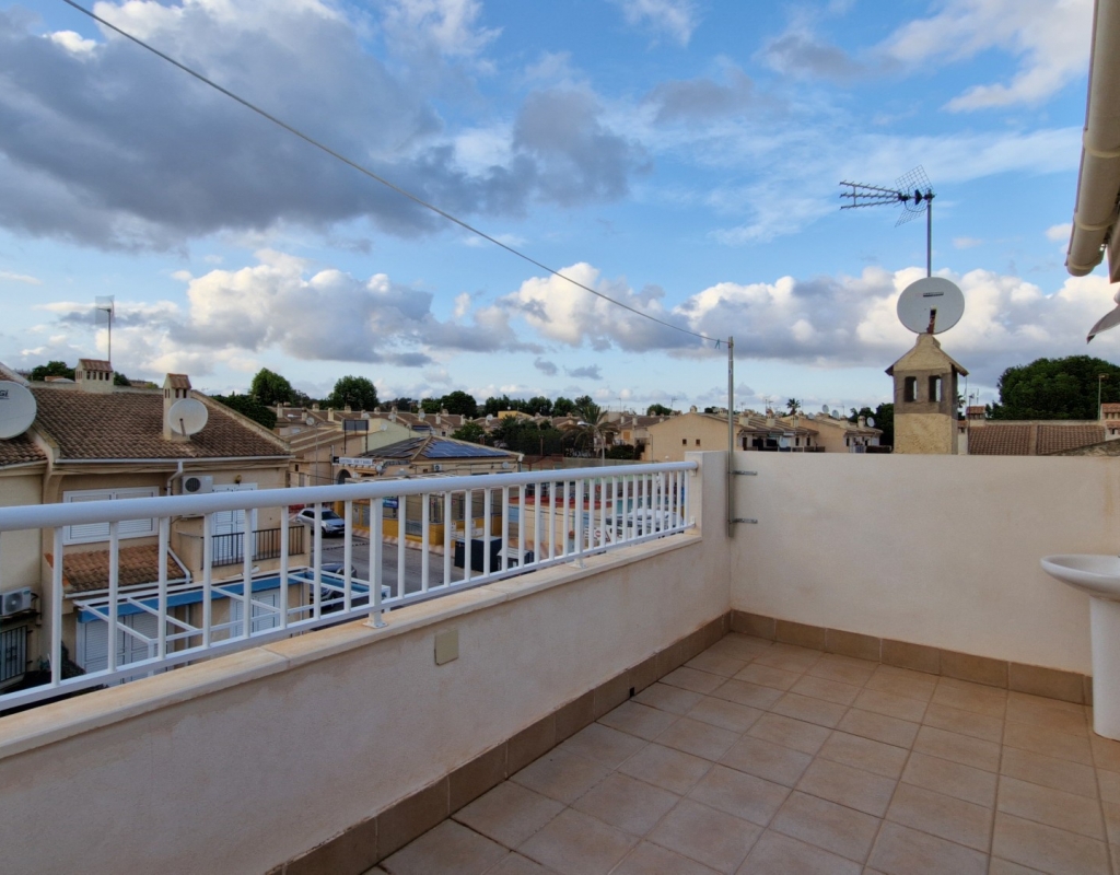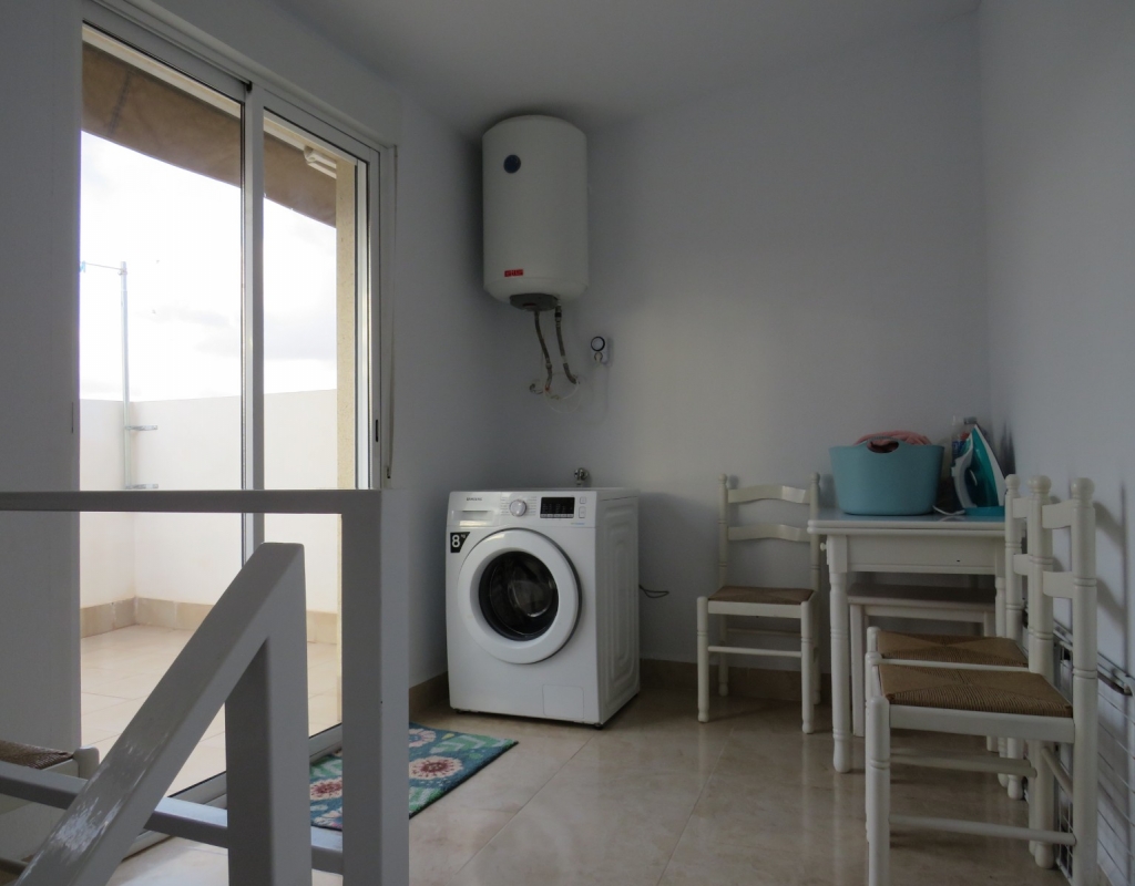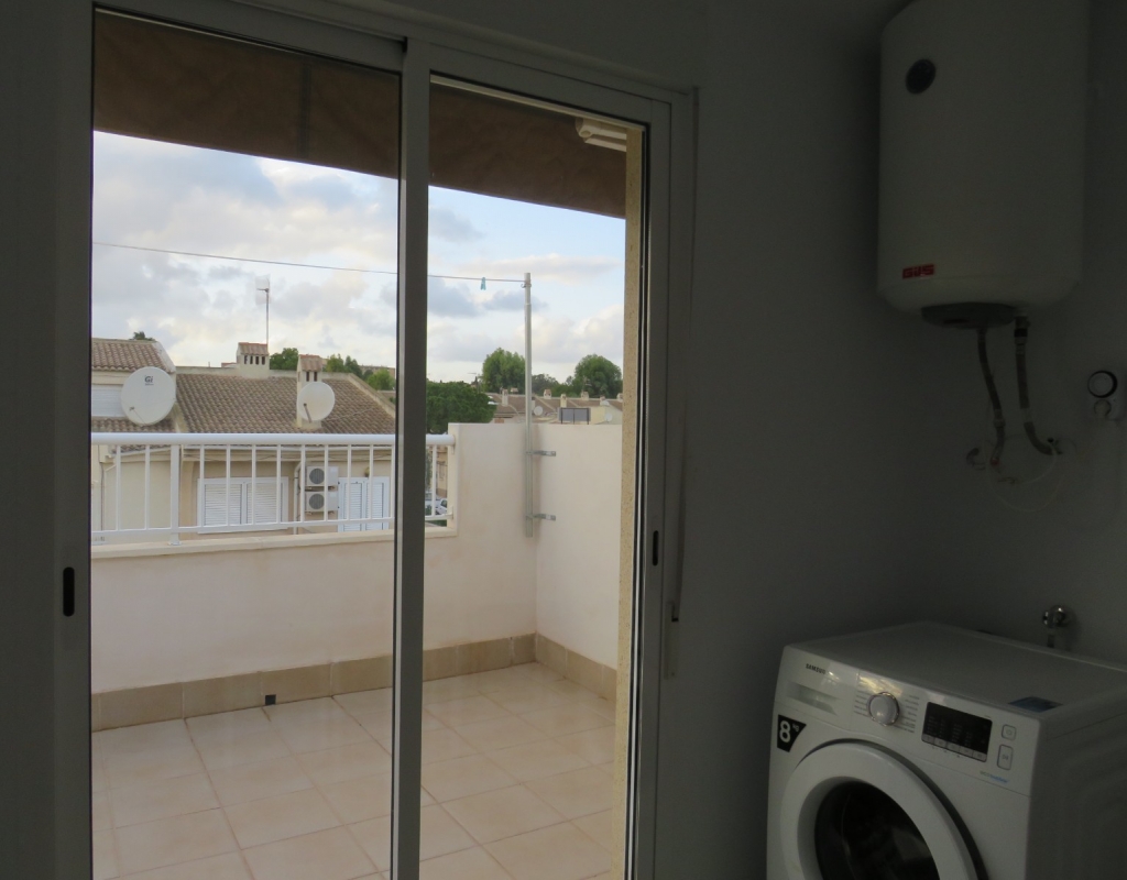 Wir sind stolz, dieses nach Westen ausgerichtete, modern eingerichtete Reihenhaus in der schönen Gegend von Buenavista, Guardamar und nur 600 Meter vom Strand entfernt zum Verkauf anbieten zu können. Das Anwesen hat eine bebaute Fläche von rund 80 m² auf drei Ebenen. Im Außenbereich finden Sie eine geräumige Terrasse mit Schuppen. Wenn Sie durch die Glasvorhänge treten, finden Sie ein geräumiges und renoviertes Wohnzimmer, eine offene, moderne Küche und ein Gäste-WC. Die Marmortreppe führt Sie nach oben, wo Sie das moderne Familienbadezimmer mit ebenerdiger Dusche und zwei Doppelschlafzimmer finden, von denen das Hauptschlafzimmer Zugang zu einem sonnigen, geräumigen Balkon hat. Eine weitere Treppe führt Sie zum Solarium, hier finden Sie einen Raum mit der Waschmaschine und dem Warmwasserbereiter sowie Doppelschiebetüren zum geräumigen privaten Solarium mit Blick auf Guardamar.