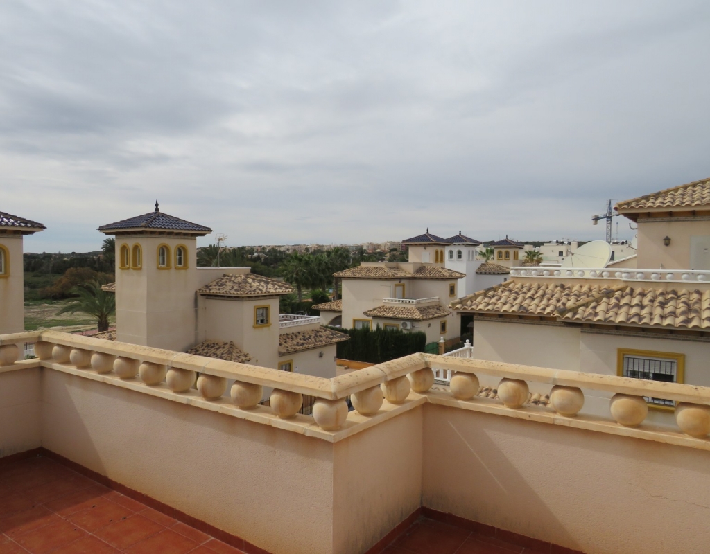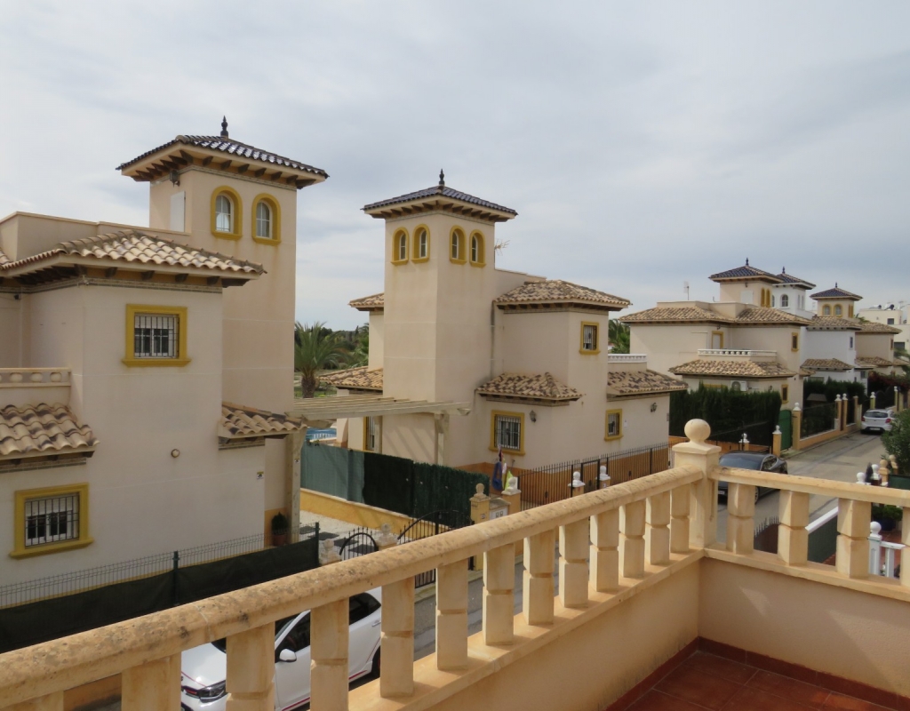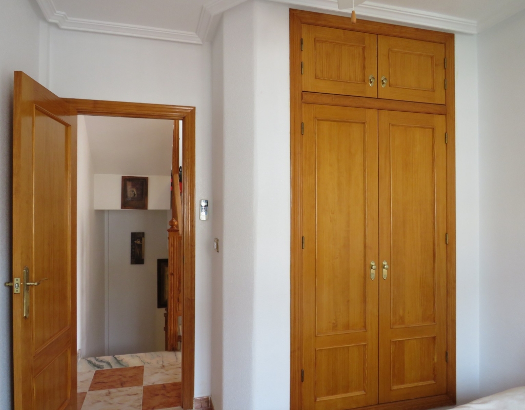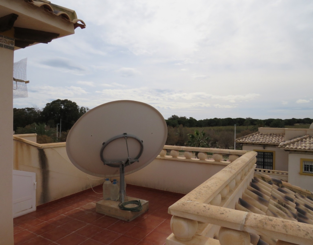 Die Marmortreppe führt Sie nach oben, wo Sie das zweite Schlafzimmer mit Einbauschrank, das Familienbadezimmer und das Hauptschlafzimmer, ebenfalls mit Einbauschränken und Doppelschiebetüren, die zu einem privaten, nach Süden ausgerichteten Balkon führen, finden. Schließlich führt die Marmortreppe hinauf zum großen privaten Solarium mit Blick auf die Pinienwälder und das Meer. Dieses außergewöhnliche Anwesen wird voll möbliert verkauft und umfasst Haushaltsgeräte. Es liegt nur vierhundert Meter oder fünf Gehminuten vom fantastischen Strand von El Pinet entfernt. Das Anwesen liegt etwas mehr als einen Kilometer vom Dorf La Marina entfernt und bietet zahlreiche Annehmlichkeiten wie Geschäfte, Bars, Restaurants, eine Apotheke, einen Supermarkt, zwei Banken und vieles mehr. Der internationale Flughafen Elche/Alicante ist mit dem Auto in zwanzig Minuten zu erreichen.