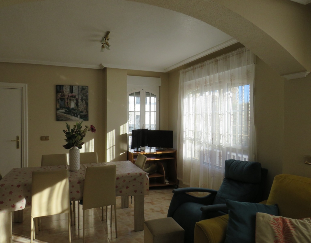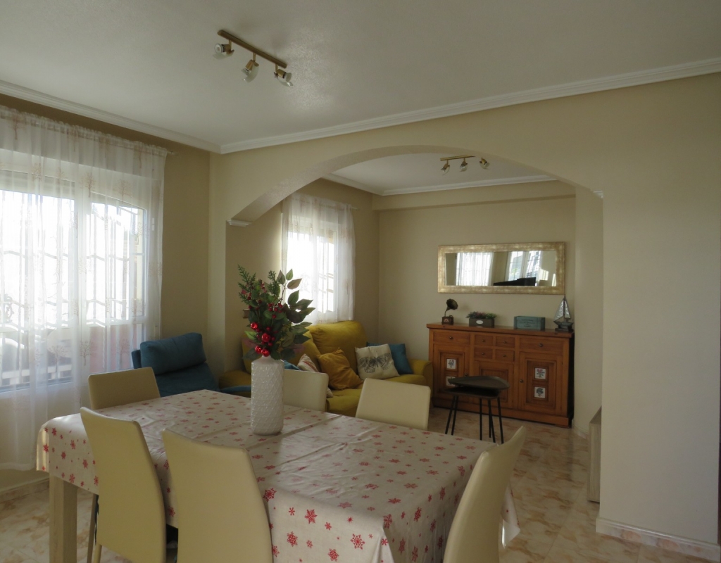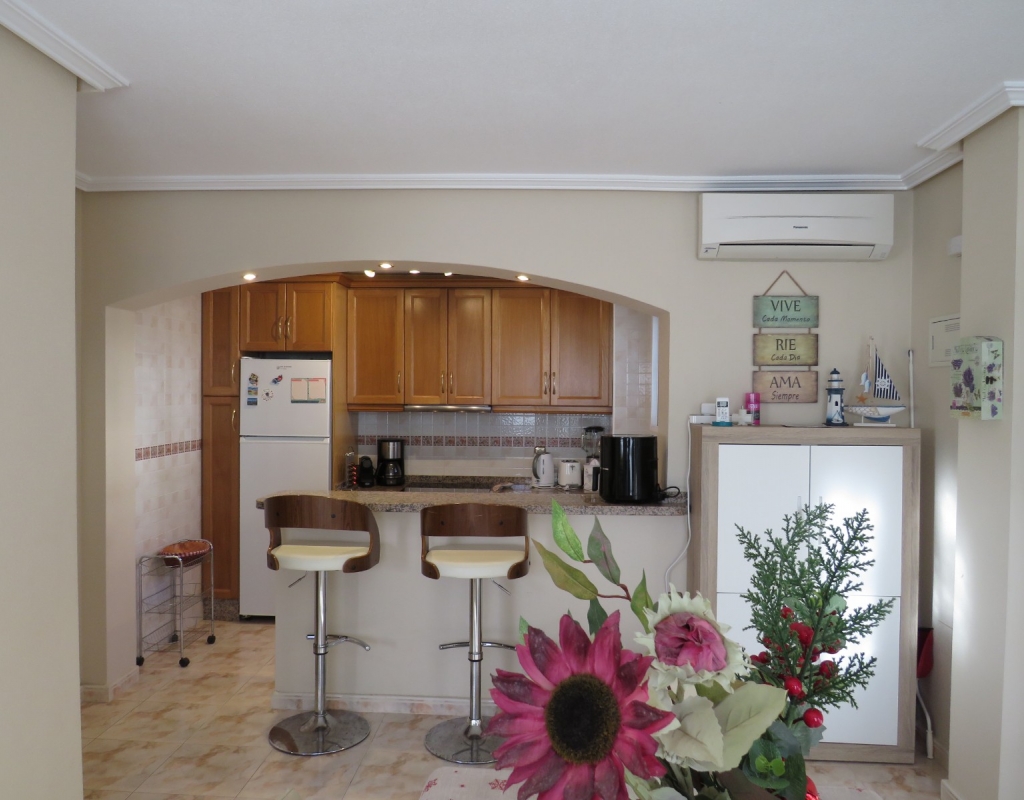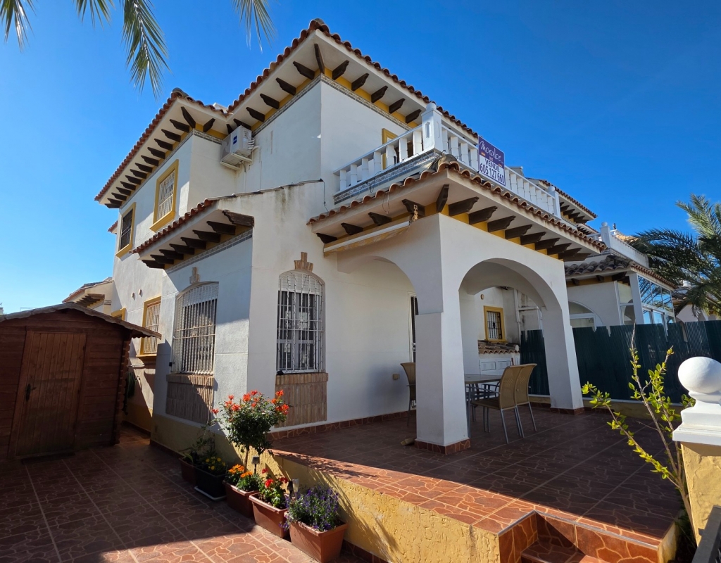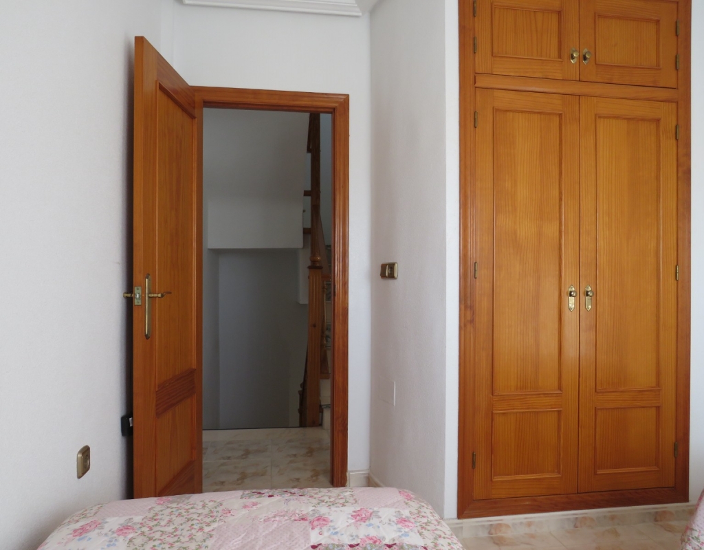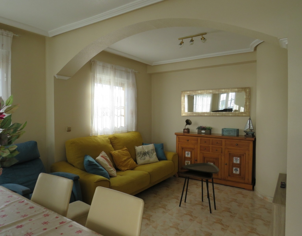 Wir freuen uns, Ihnen diese wunderschöne, nach Nordosten ausgerichtete Vierfamilienvilla in El Pinet, Elche, Alicante, an der südlichen Costa Blanca präsentieren zu dürfen. Das Anwesen verfügt über eine Wohnfläche von ca. 85 m² und bietet im Erdgeschoss eine geschlossene Terrasse, die als privater Parkplatz genutzt werden kann, einen Abstellraum aus Holz sowie eine Veranda mit freiem Ausblick. Unter dem Küchenfenster befindet sich ein kleiner Abstellraum mit Waschmaschine. Beim Betreten des Hauses gelangen Sie in ein geräumiges und helles Wohnzimmer mit Klimaanlage (warm/kalt), einen Essbereich, eine offene Küche und ein kleines Badezimmer mit Dusche. Außerdem gibt es schnelles Glasfaserinternet mit einer Geschwindigkeit von 600 Mbit/s.