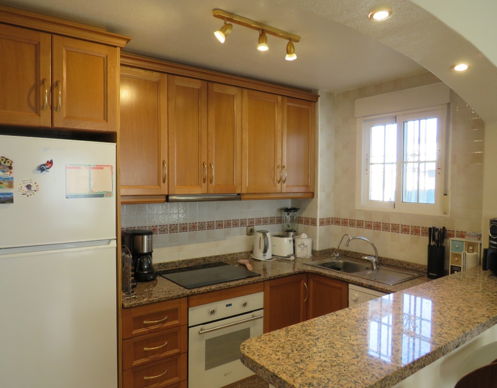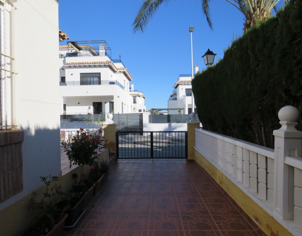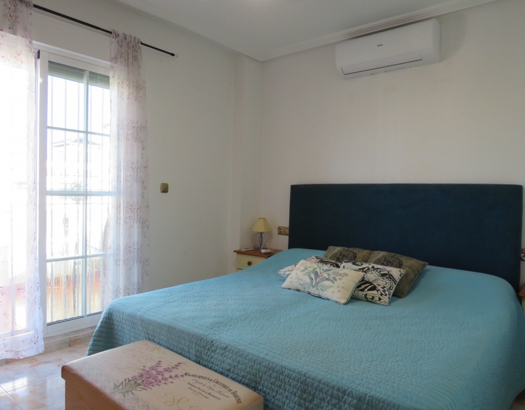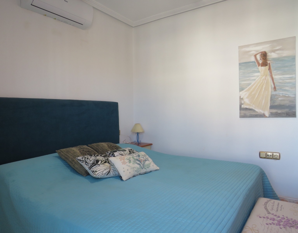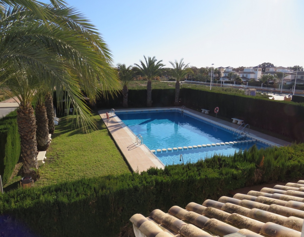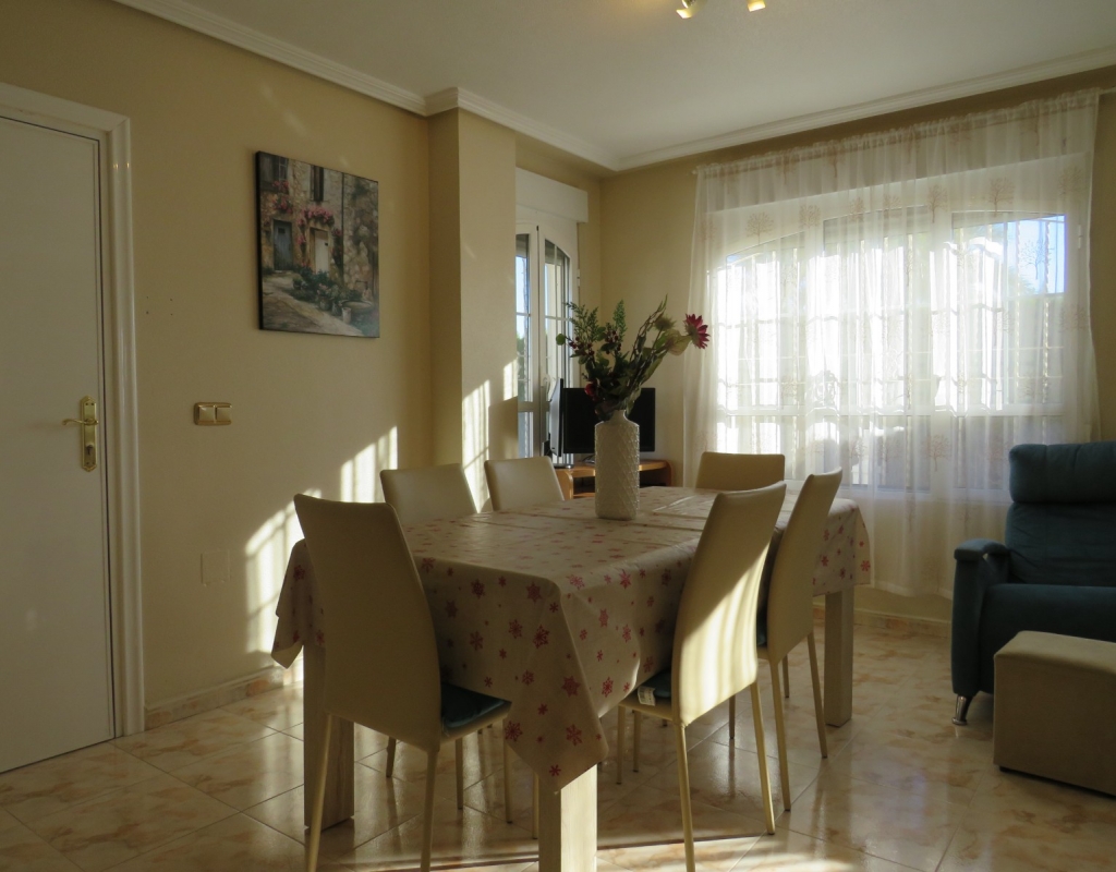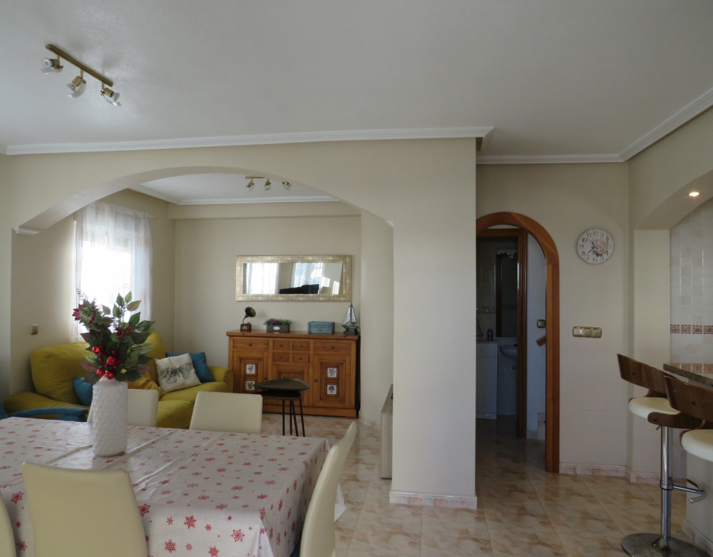 Wir freuen uns, Ihnen diese wunderschöne, nach Nordosten ausgerichtete Vierfamilienvilla in El Pinet, Elche, Alicante, an der südlichen Costa Blanca präsentieren zu dürfen. Das Anwesen verfügt über eine Wohnfläche von ca. 85 m² und bietet im Erdgeschoss eine geschlossene Terrasse, die als privater Parkplatz genutzt werden kann, einen Abstellraum aus Holz sowie eine Veranda mit freiem Ausblick. Unter dem Küchenfenster befindet sich ein kleiner Abstellraum mit Waschmaschine. Beim Betreten des Hauses gelangen Sie in ein geräumiges und helles Wohnzimmer mit Klimaanlage (warm/kalt), einen Essbereich, eine offene Küche und ein kleines Badezimmer mit Dusche. Außerdem gibt es schnelles Glasfaserinternet mit einer Geschwindigkeit von 600 Mbit/s.