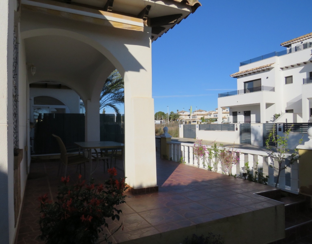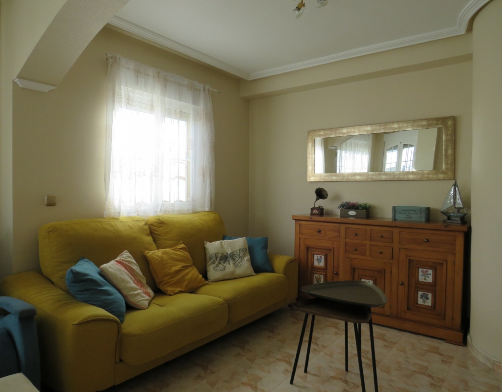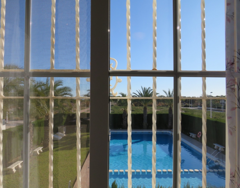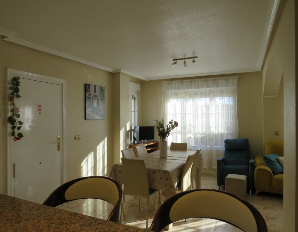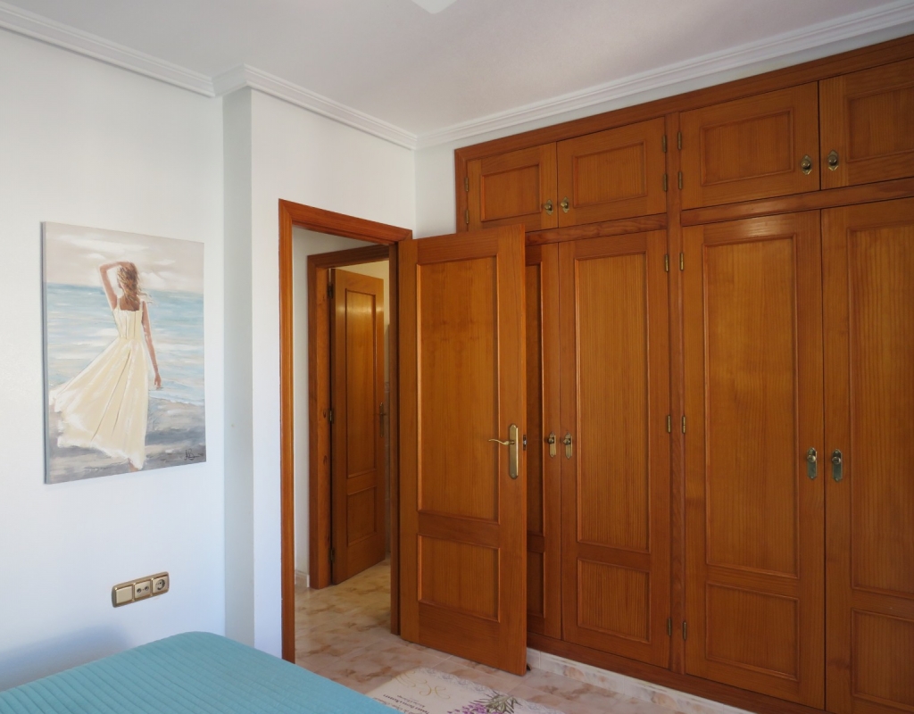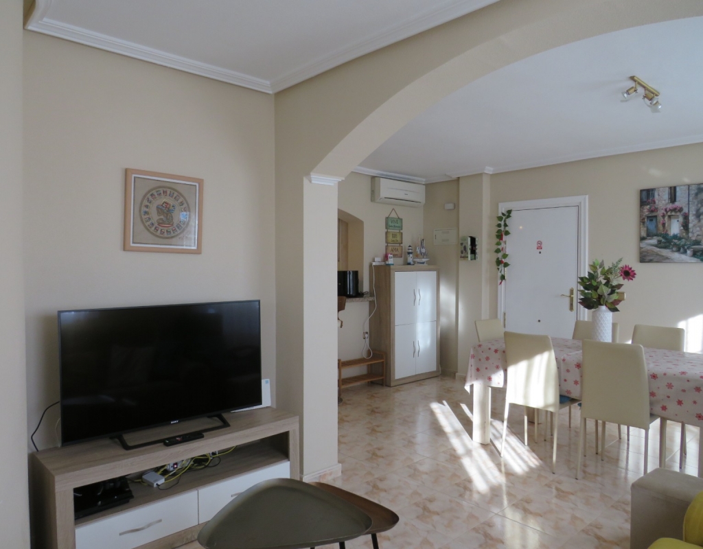 Wir freuen uns, Ihnen diese wunderschöne, nach Nordosten ausgerichtete Vierfamilienvilla in El Pinet, Elche, Alicante, an der südlichen Costa Blanca präsentieren zu dürfen. Das Anwesen verfügt über eine Wohnfläche von ca. 85 m² und bietet im Erdgeschoss eine geschlossene Terrasse, die als privater Parkplatz genutzt werden kann, einen Abstellraum aus Holz sowie eine Veranda mit freiem Ausblick. Unter dem Küchenfenster befindet sich ein kleiner Abstellraum mit Waschmaschine. Beim Betreten des Hauses gelangen Sie in ein geräumiges und helles Wohnzimmer mit Klimaanlage (warm/kalt), einen Essbereich, eine offene Küche und ein kleines Badezimmer mit Dusche. Außerdem gibt es schnelles Glasfaserinternet mit einer Geschwindigkeit von 600 Mbit/s.