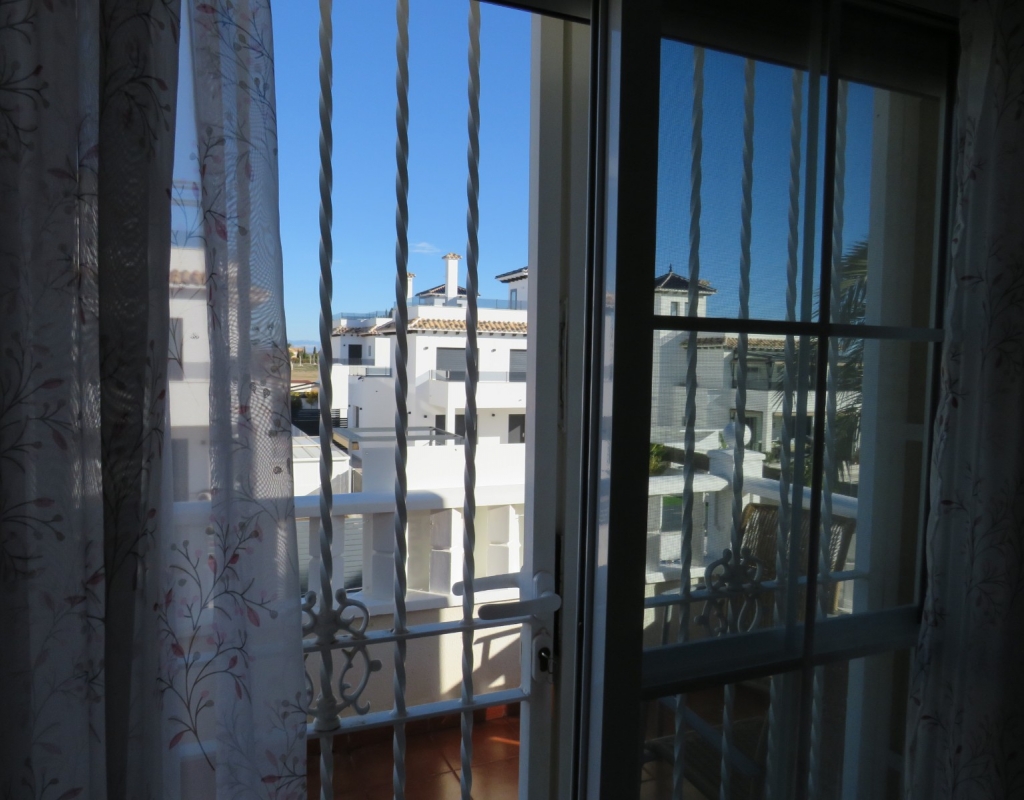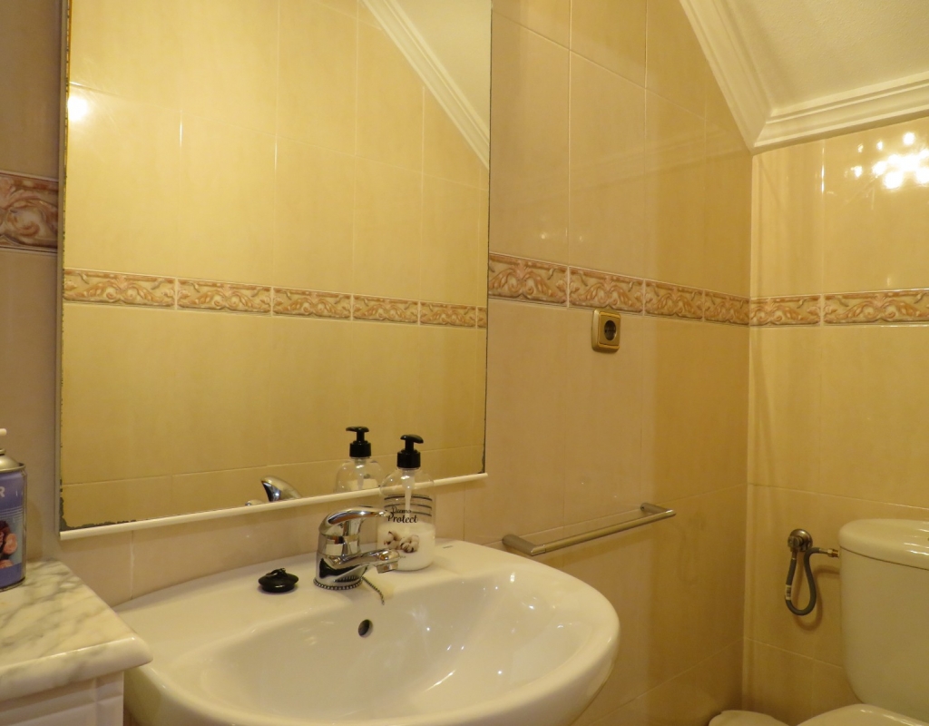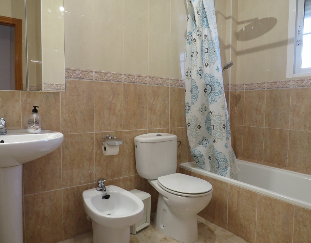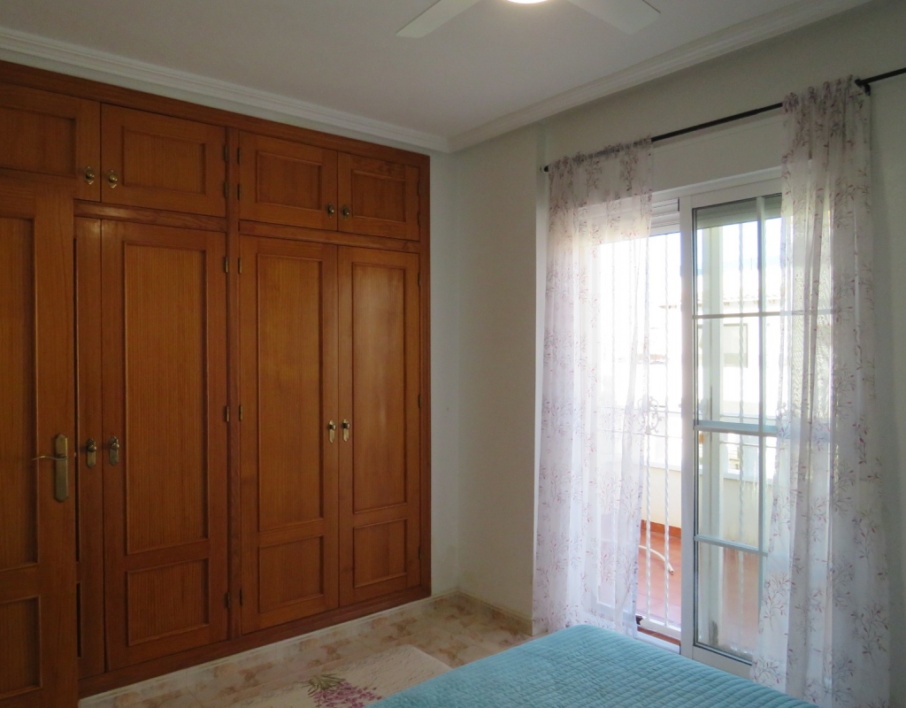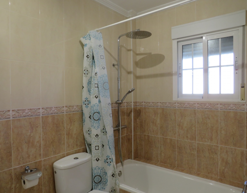 Über die Marmortreppe erreichen Sie das Obergeschoss mit dem Familienbad (Badewanne und Dusche), dem zweiten Schlafzimmer mit Einbauschrank und dem Hauptschlafzimmer, ebenfalls mit Einbauschrank und Zugang zu einem privaten Balkon mit Meerblick. Beide Schlafzimmer sind mit Klimaanlage (warm/kalt) ausgestattet.