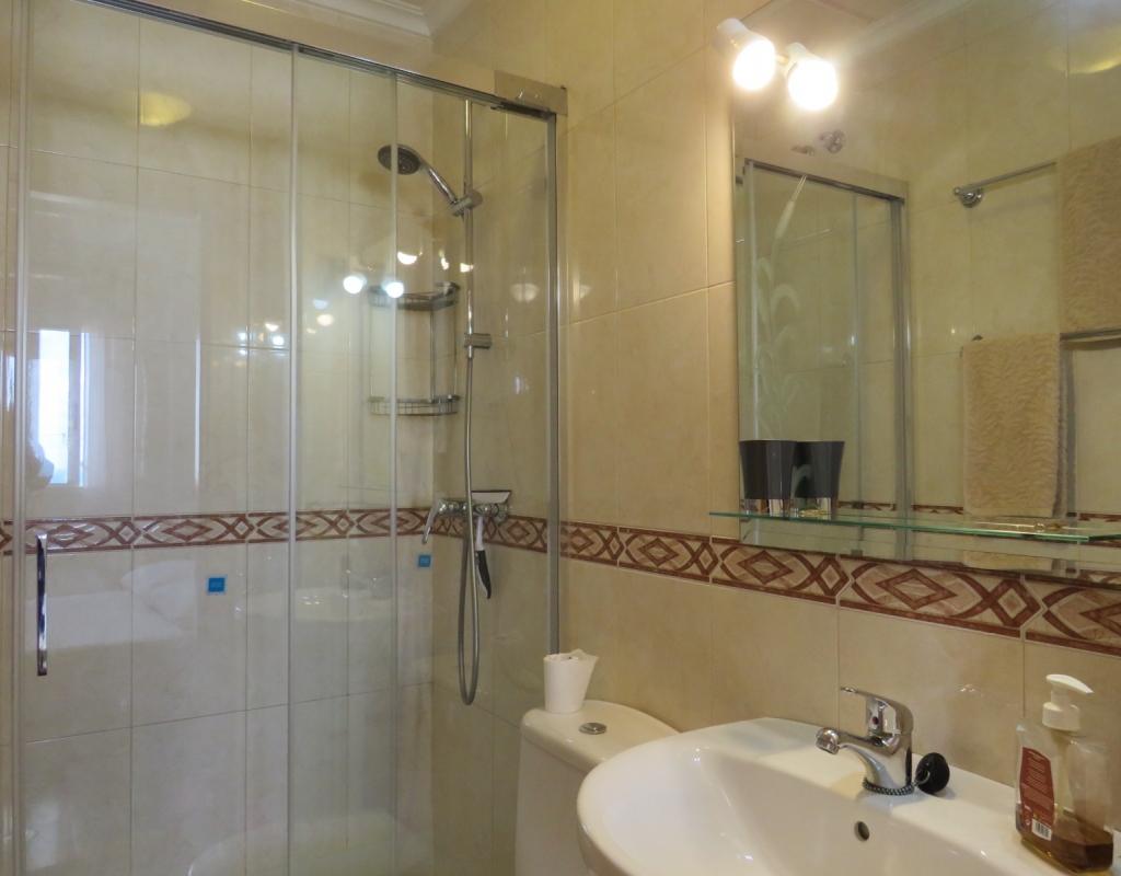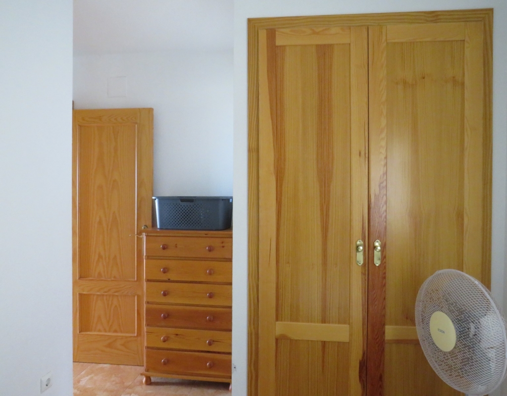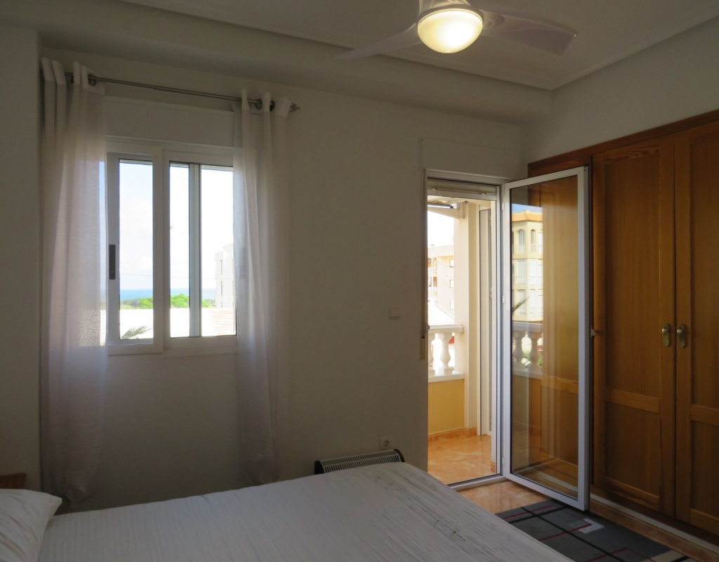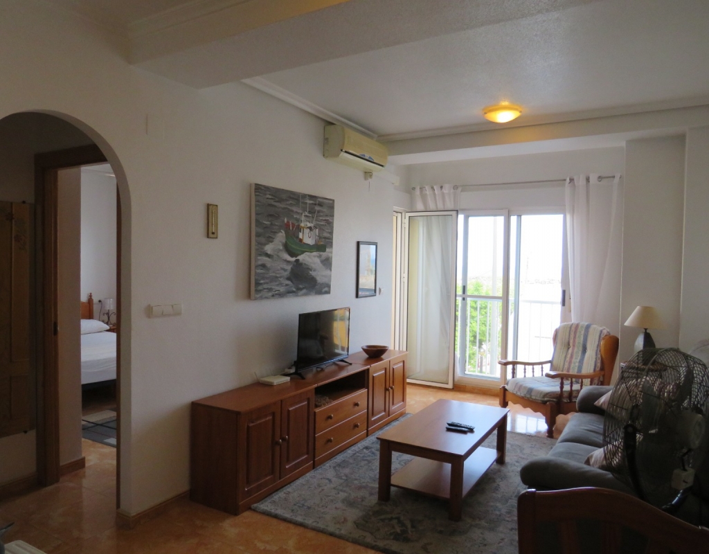 Un arco conduce al dormitorio principal con baño en suite y al mismo balcón, al que se accede desde el salón con vistas al mar. Hay un baño familiar y, finalmente, un segundo dormitorio pequeño. La propiedad se vende amueblada e incluye electrodomésticos.