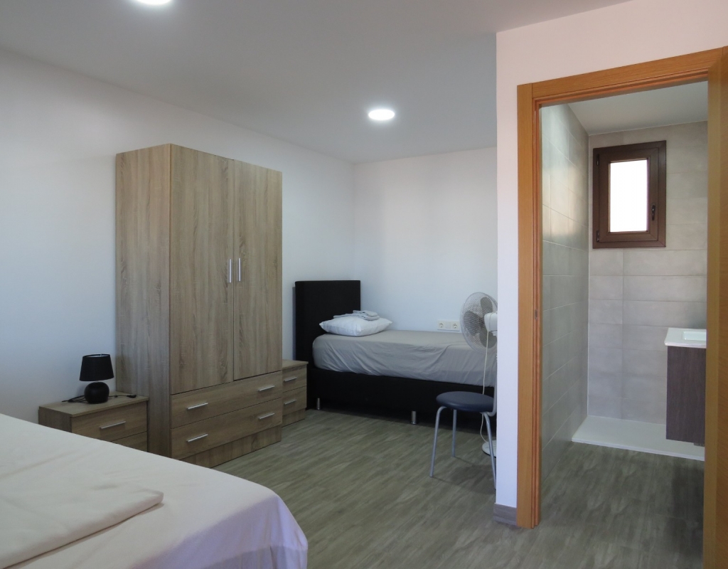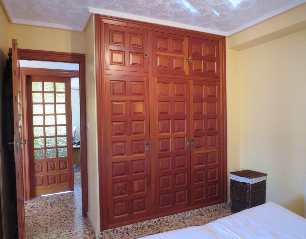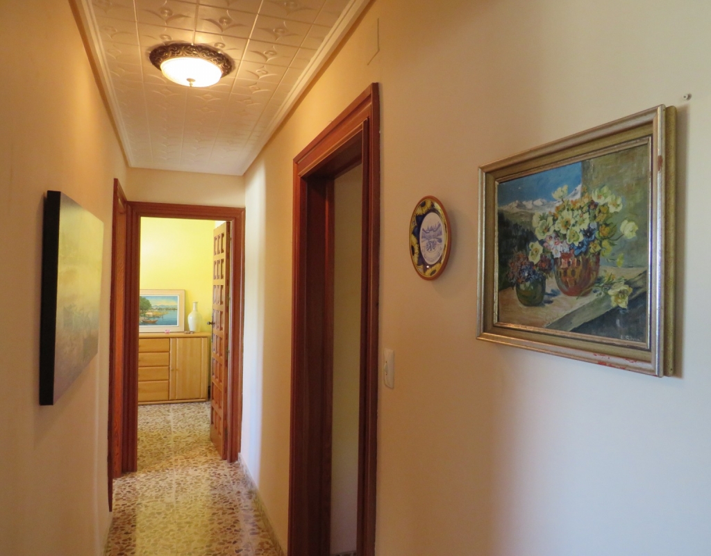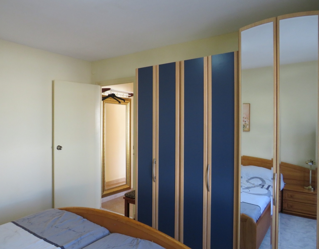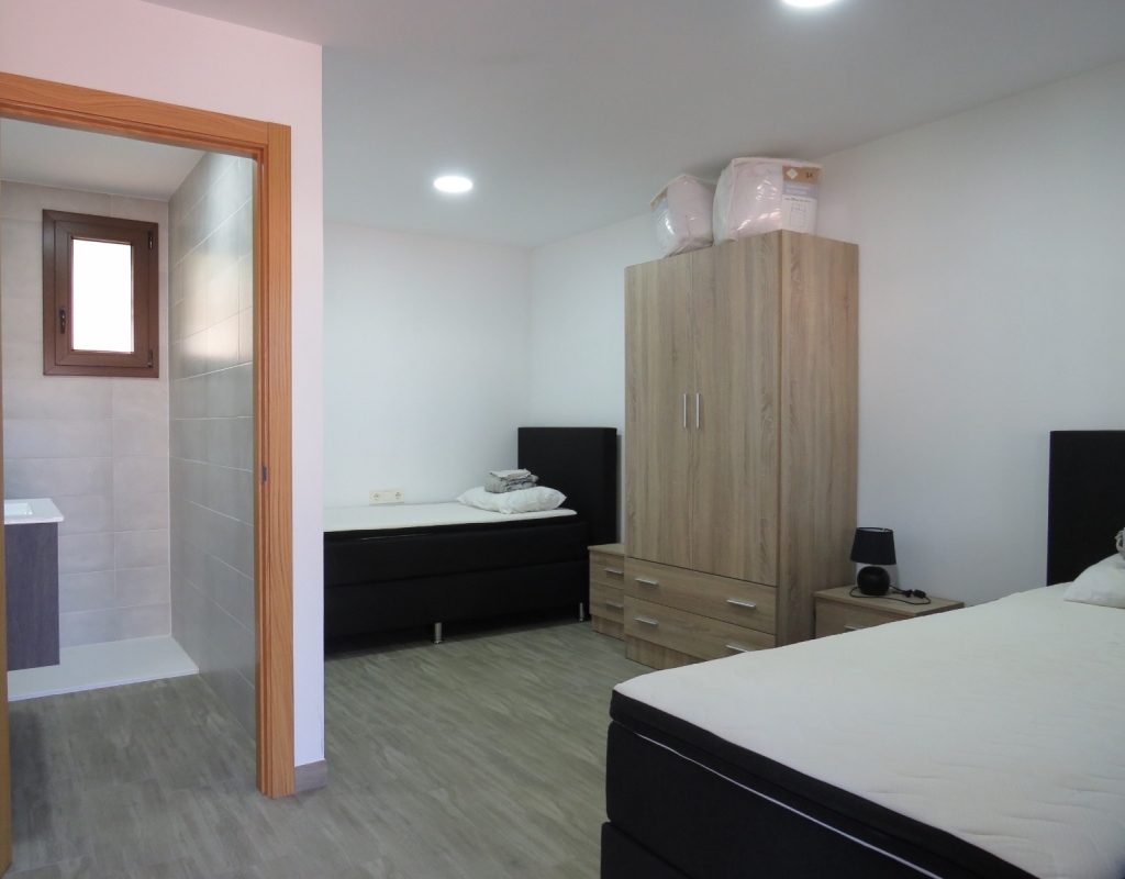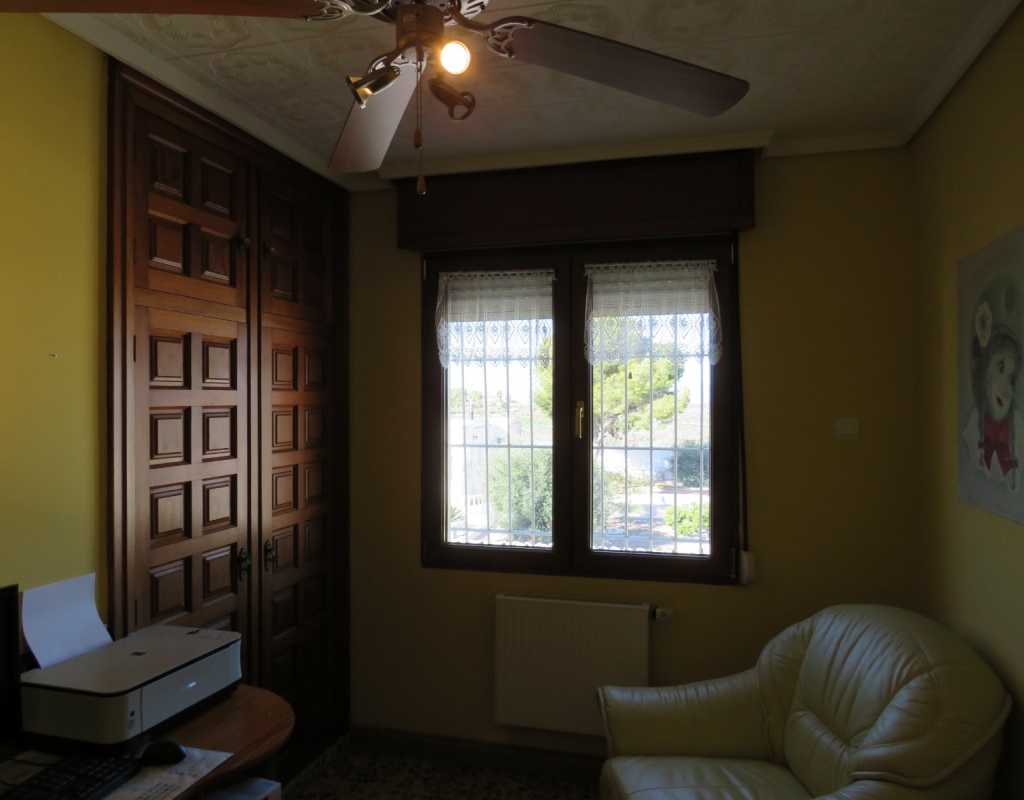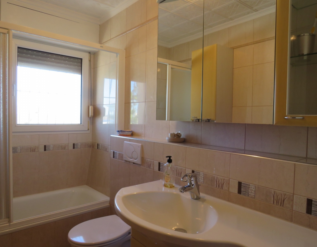 La escalera lateral conduce a la planta superior, donde encontrará un amplio balcón acristalado con vistas al jardín, la piscina y Santa Pola. Aquí también encontrará la entrada a la segunda zona habitable, que consta de un amplio salón con estufa de pellets, una gran cocina, un baño y tres dormitorios. La escalera exterior conduce a un amplio solárium privado con vistas panorámicas al mar. Detrás de la casa hay un gran trastero para bicicletas, etc., y un lavadero que alberga la calefacción central de gasoil. Hay dos apartamentos independientes de un dormitorio y un baño para invitados, y debajo de estos se encuentra un amplio sótano.