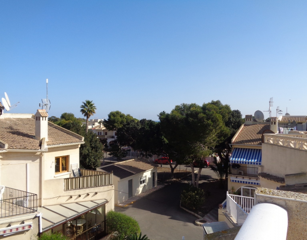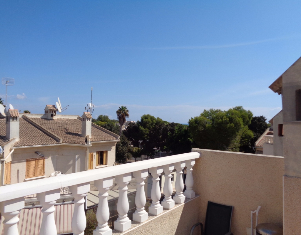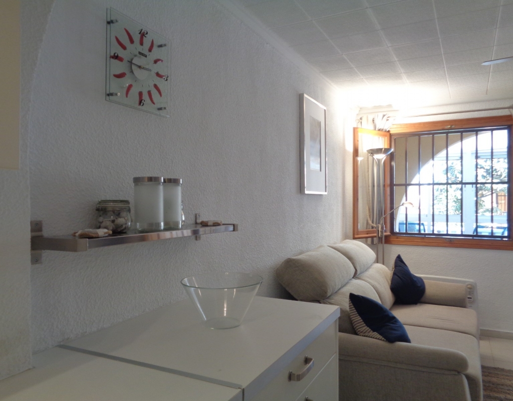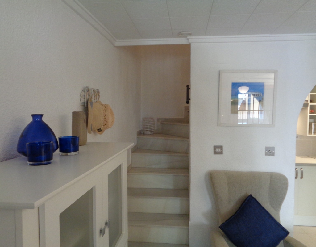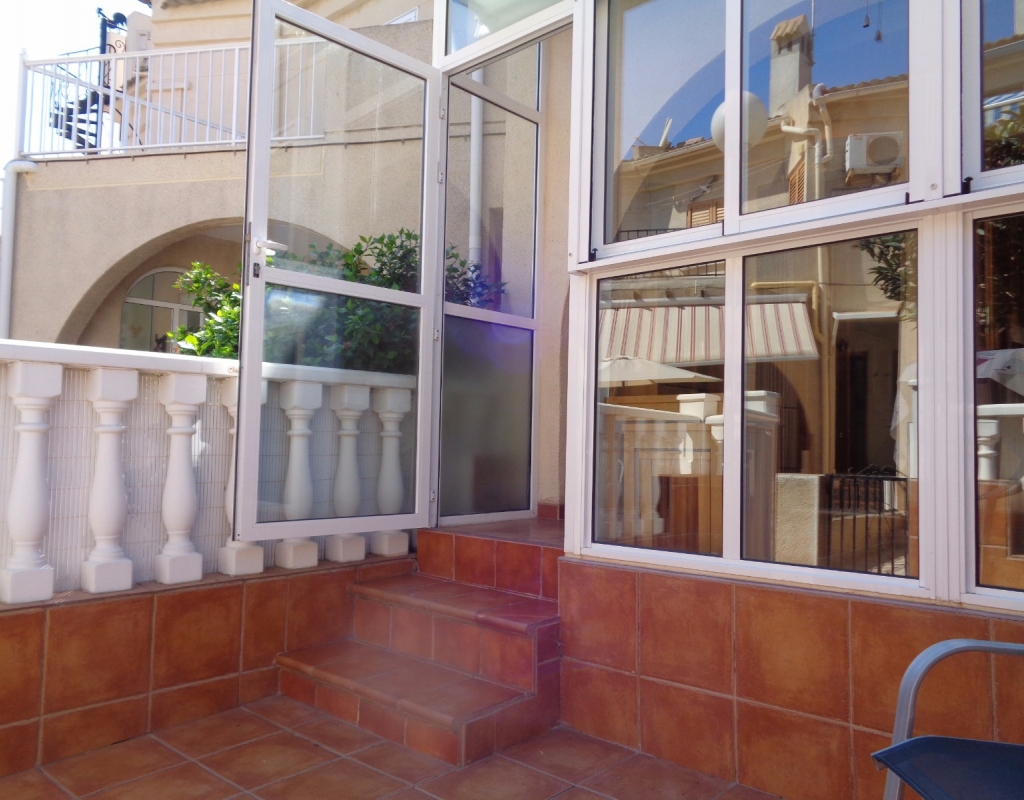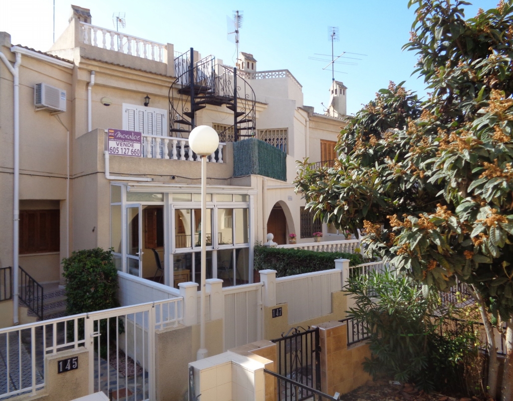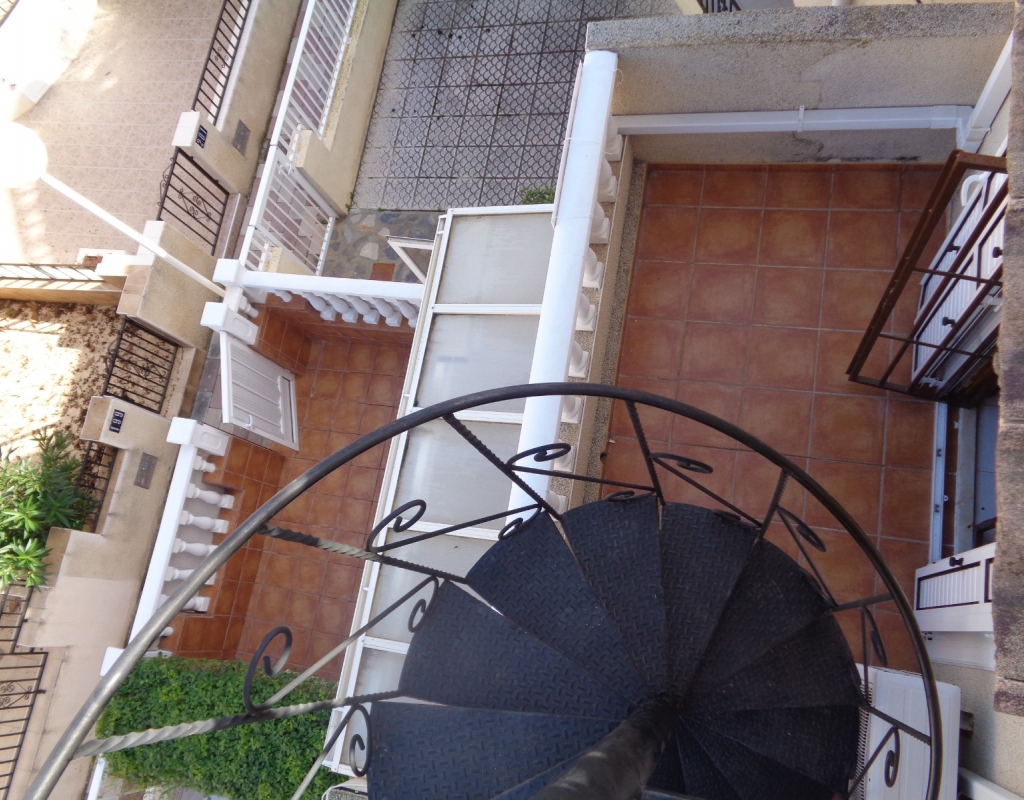 Here we have a stunning bright and airy one bedroom bungalow for sale in Urb. Buenavista, only 700 meters from the beach, The property has a living area of around 46 m² in which you will find on the ground floor, a terrace, spacious glazed porch, a living room and a recently fitted new open plan kitchen. The staircase leads you to the second floor where you will find the bathroom, a storage cupboard, the bedroom which opens onto a balcony with spiral staircase that leads you to a very spacious private solarium with great views.