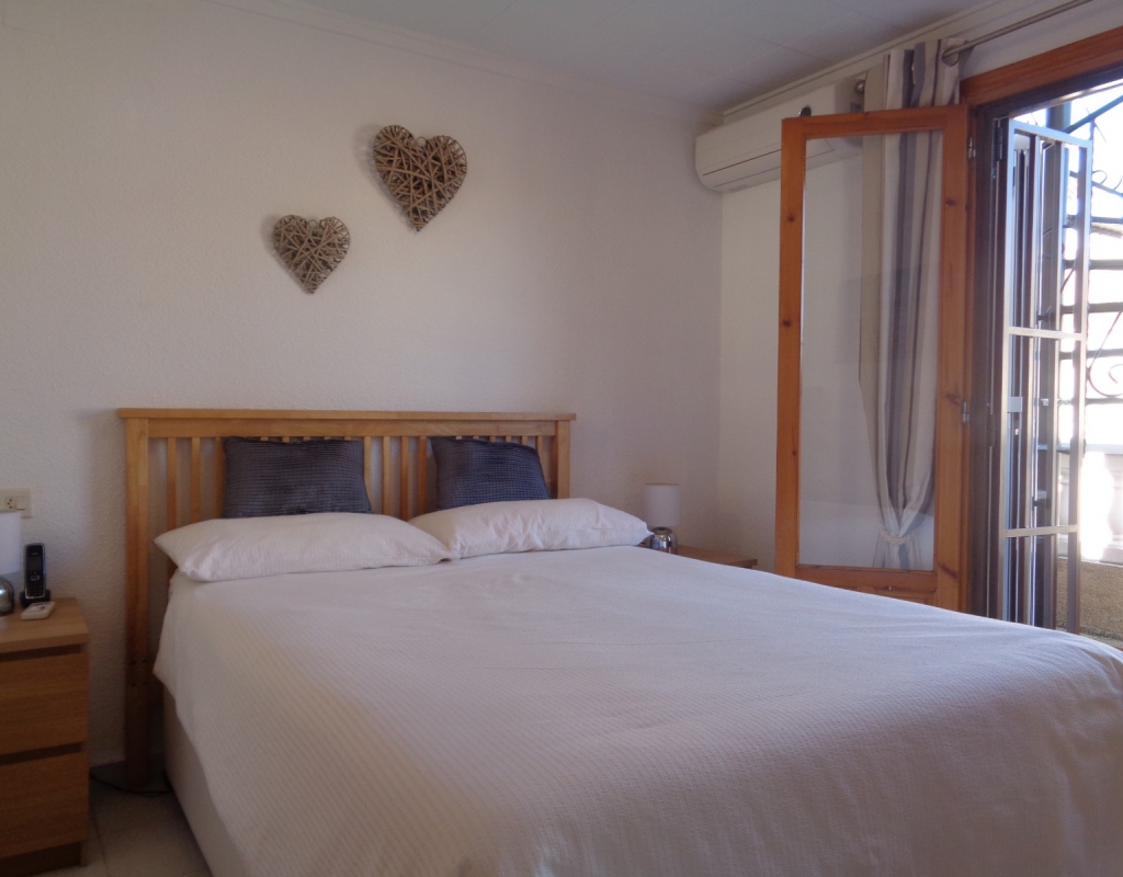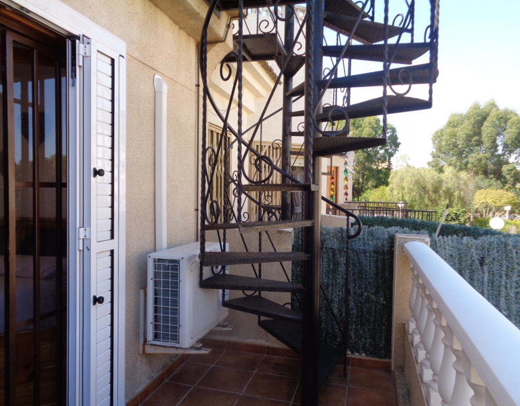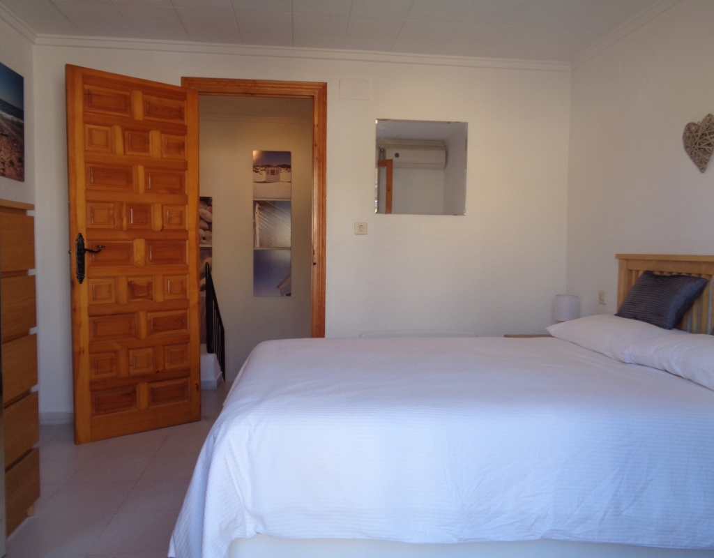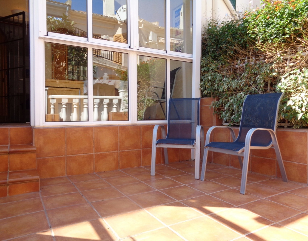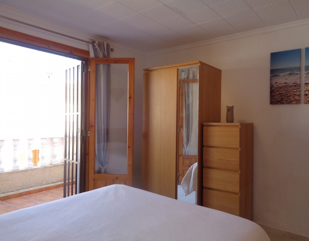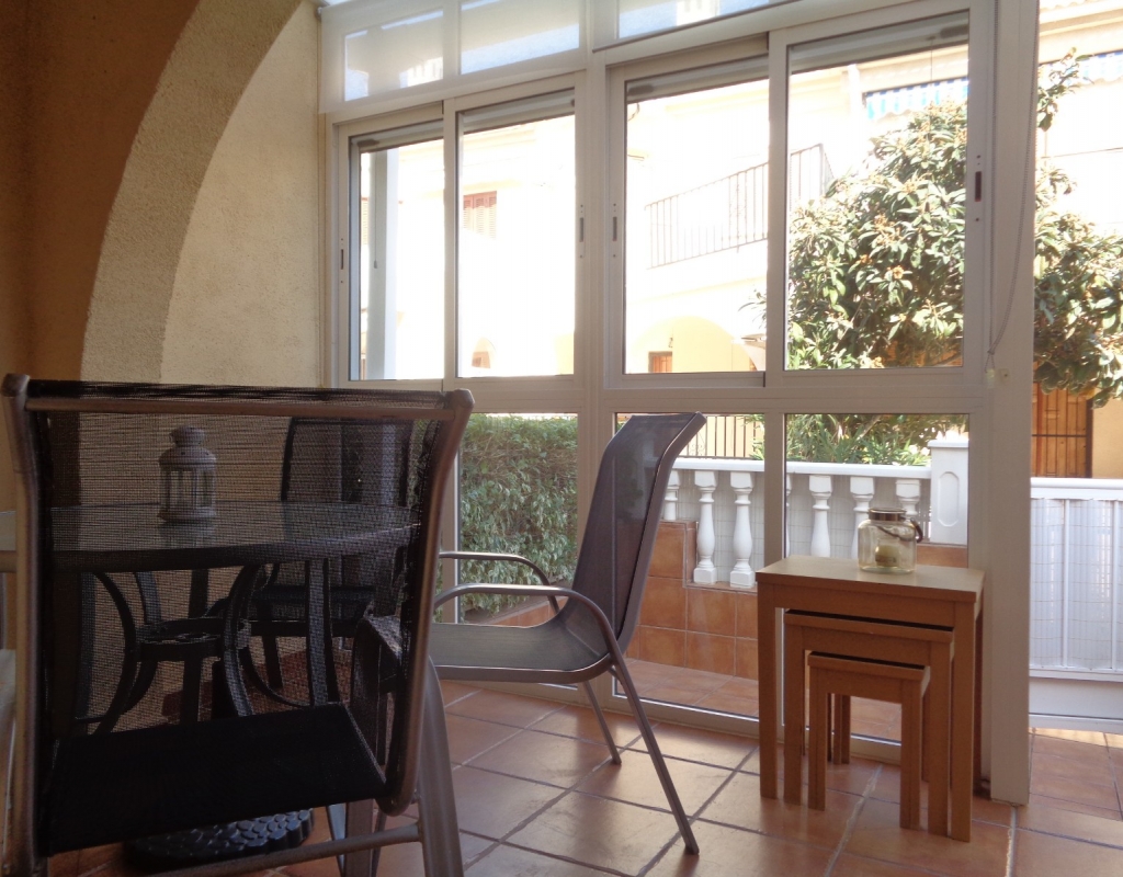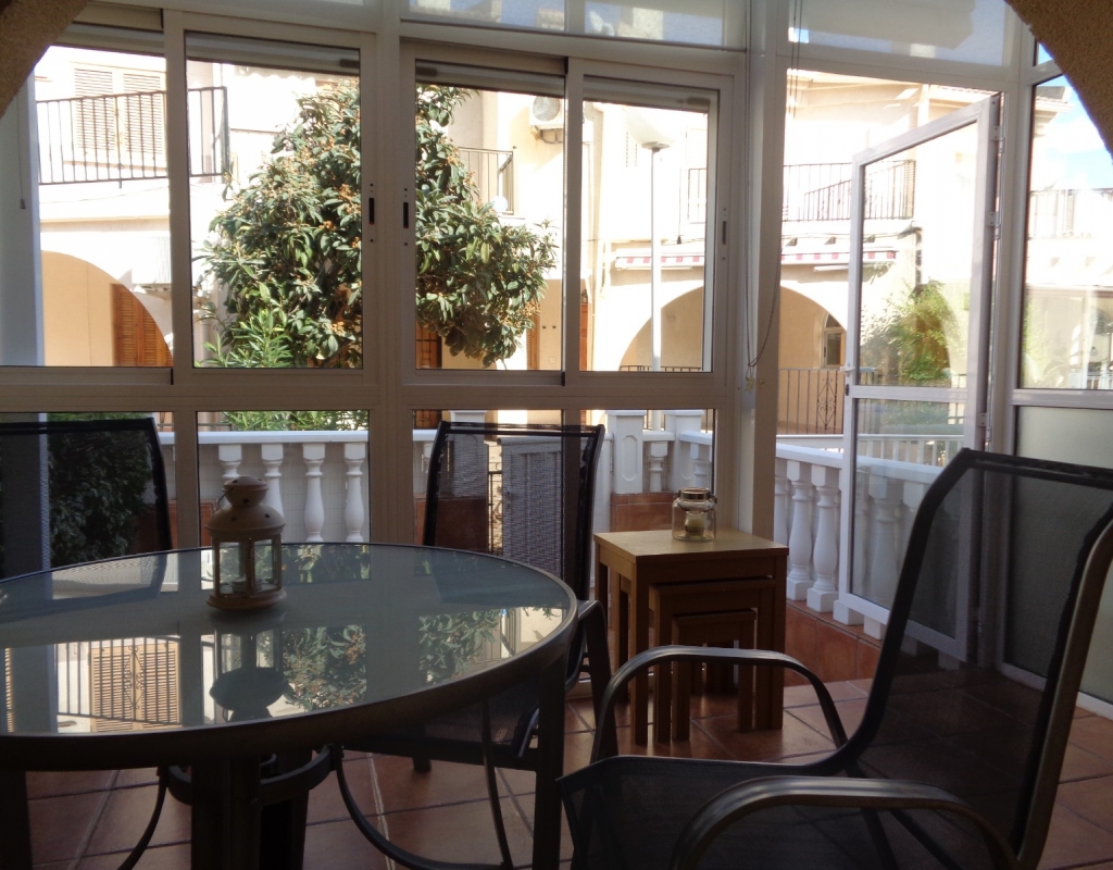 Here we have a stunning bright and airy one bedroom bungalow for sale in Urb. Buenavista, only 700 meters from the beach, The property has a living area of around 46 m² in which you will find on the ground floor, a terrace, spacious glazed porch, a living room and a recently fitted new open plan kitchen. The staircase leads you to the second floor where you will find the bathroom, a storage cupboard, the bedroom which opens onto a balcony with spiral staircase that leads you to a very spacious private solarium with great views.