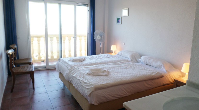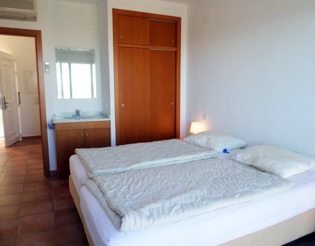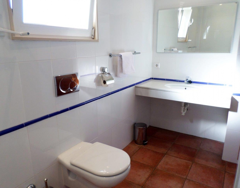 Upstairs is the main entrance with its patio in front, hall, laundry and two double bedrooms, each with integrated wash basin unit and access to the balcony that stretches along the whole villa´s width. A full bathroom completes this floor. Further storage is provided by an ample room with access from the pool terrace.