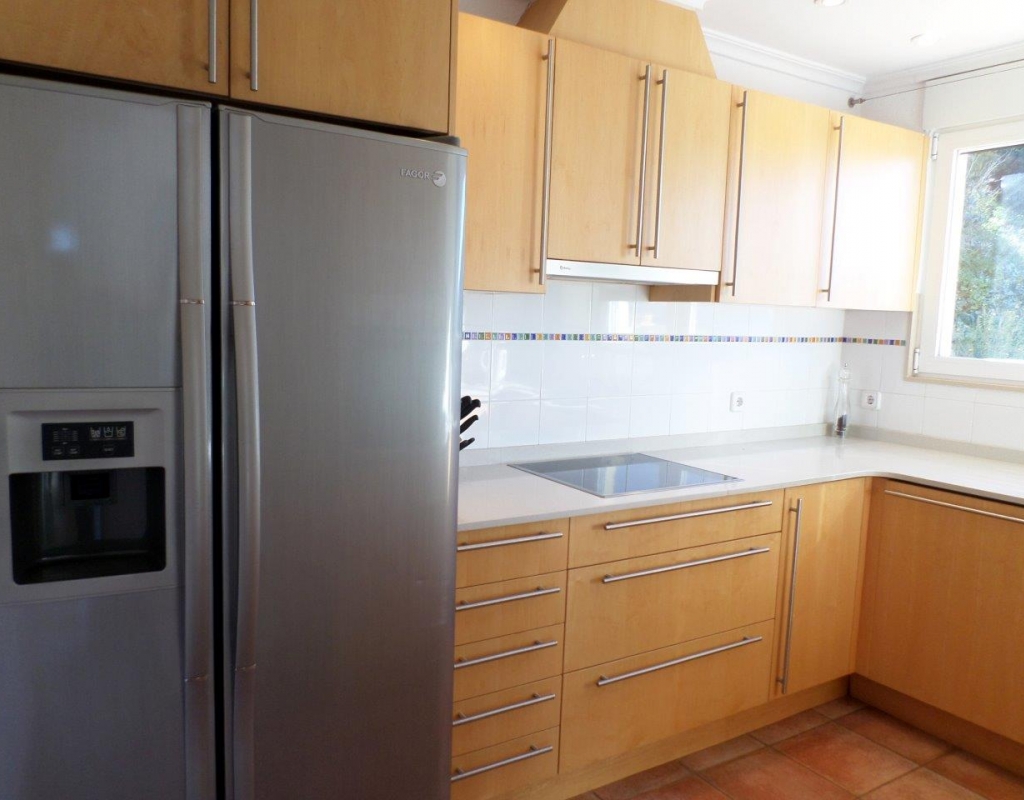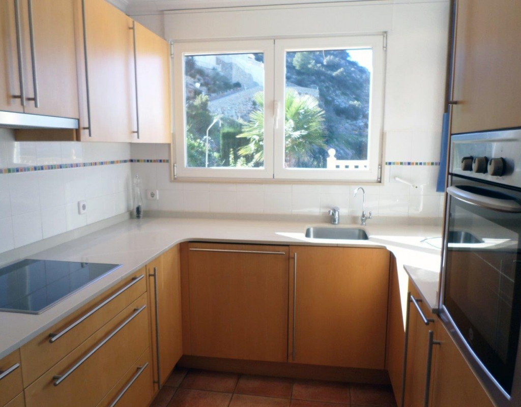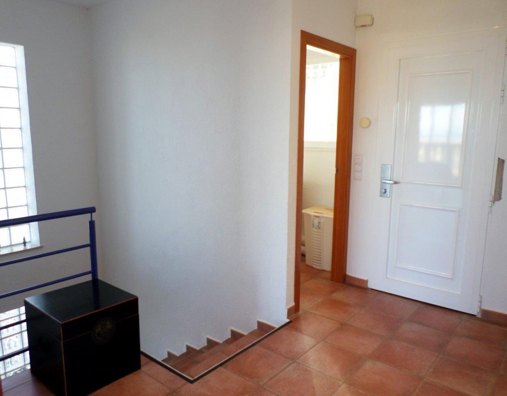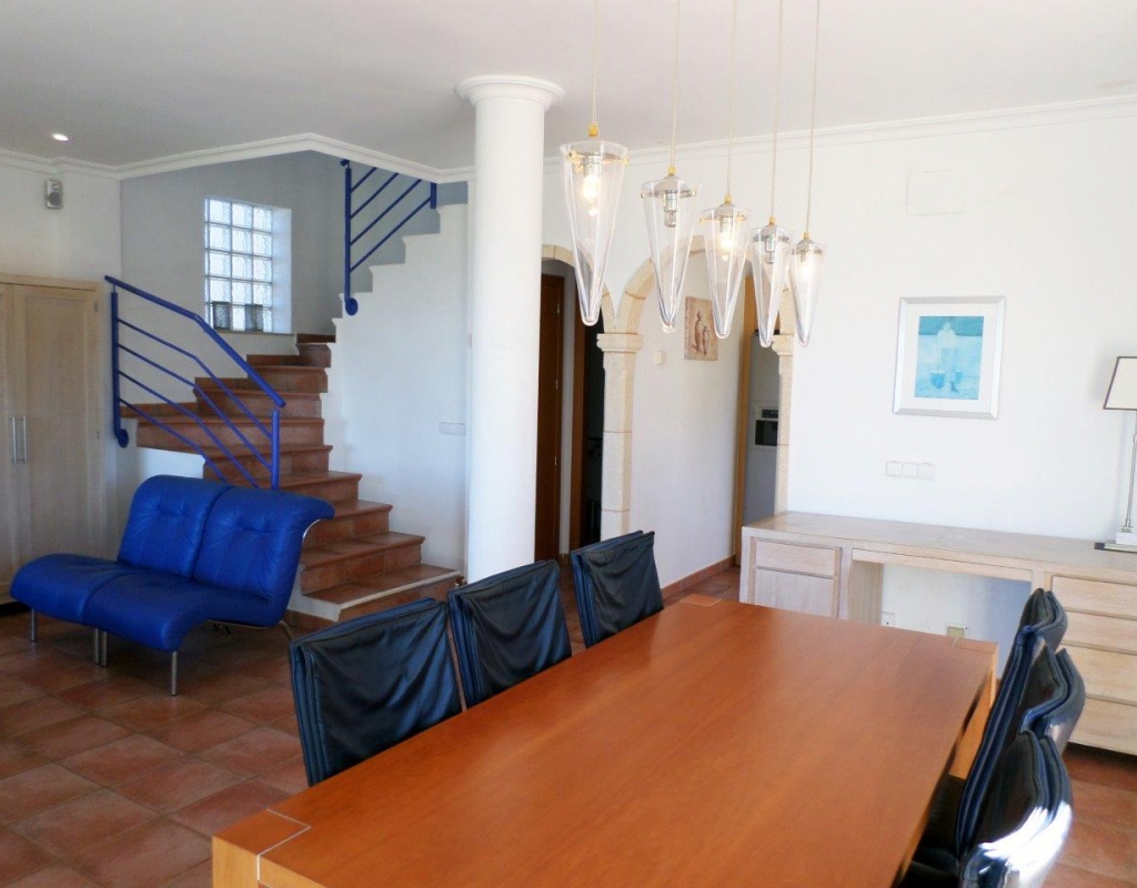 The lower floor, on one level with the lovely pool and a good sized terrace, hosts the open lounge and dining area featuring various patio doors and a fantastic picture window capturing the strikingly beautiful views. It´s pool terrace offers sunshine, as well during the winter months. Separated by two lovely Tosca arches lies the built-in kitchen, which is fully equipped, a lockable storage area underneath the staircase and a shower room.