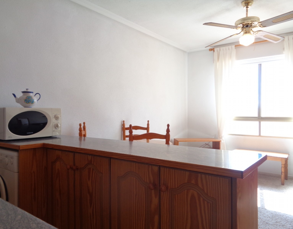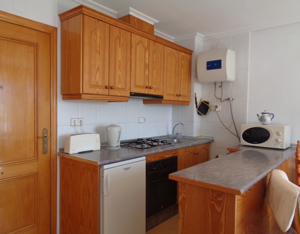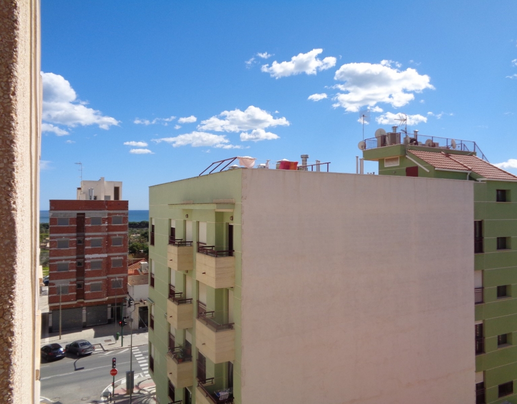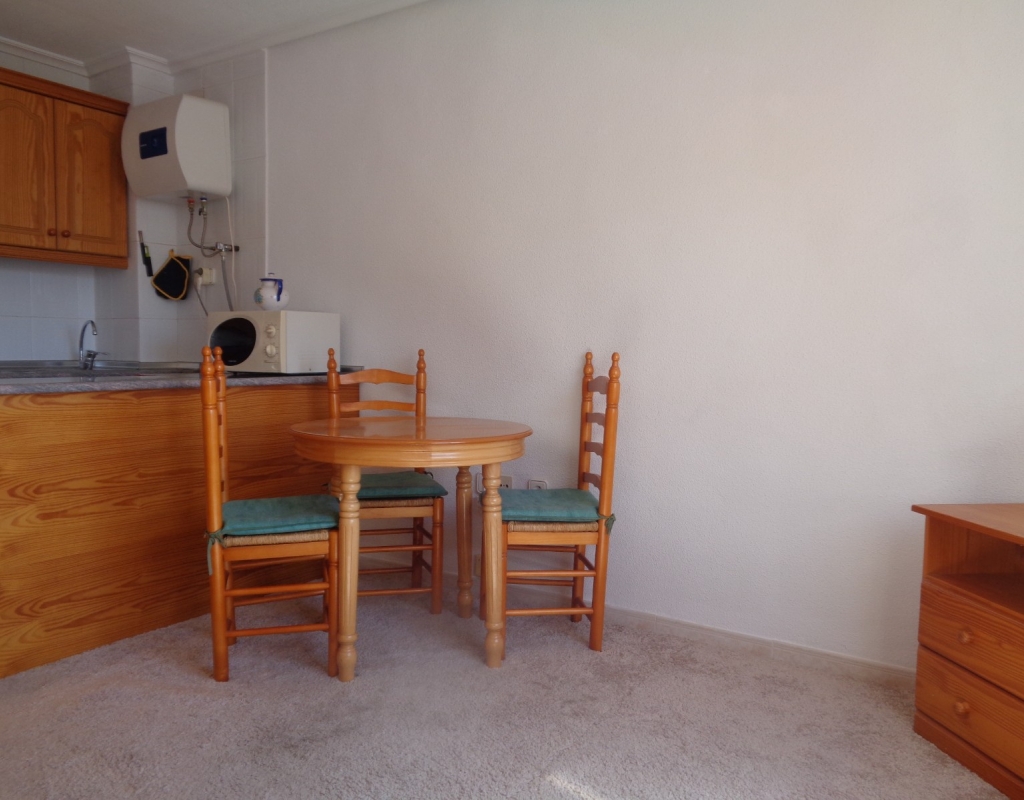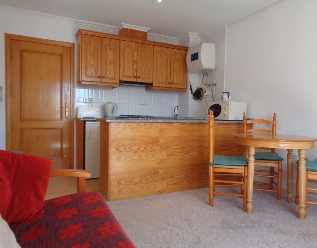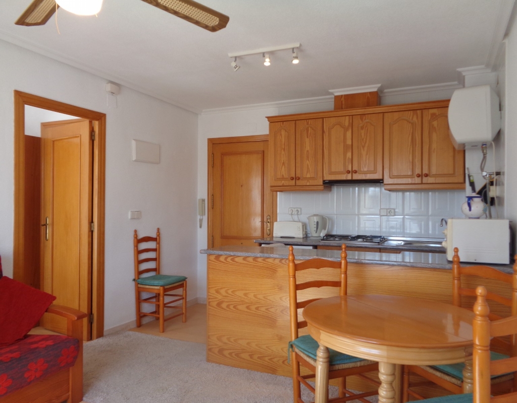 Here we have a top floor, south facing, one bedroom apartment for sale in the lovely village of La Marina and only 800 meters from the beach. The property consists of an open plan kitchen, living/dining room, one double bedroom and en suite bathroom. it is sold furnished and includes white goods. The apartment sits close to the many amenities the village has to offer, is literally a ten minute walk from the beautiful golden beach and is just a 20 minute journey from Alicante International Airport.
