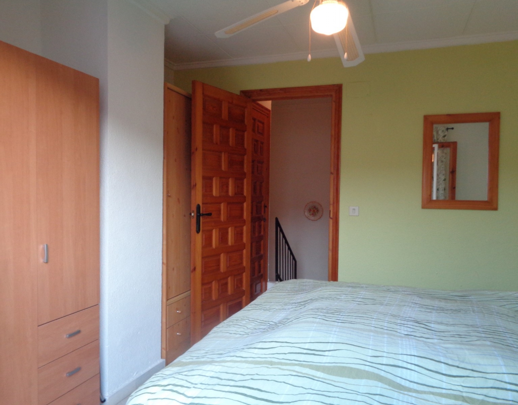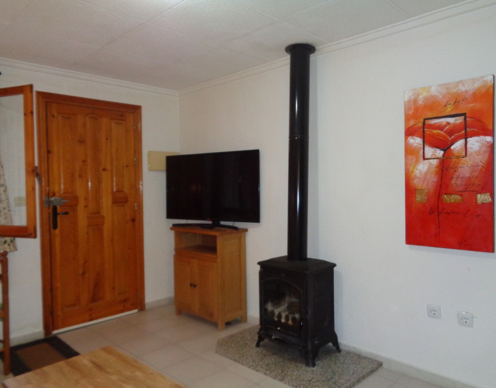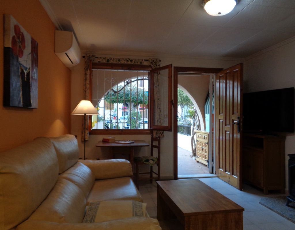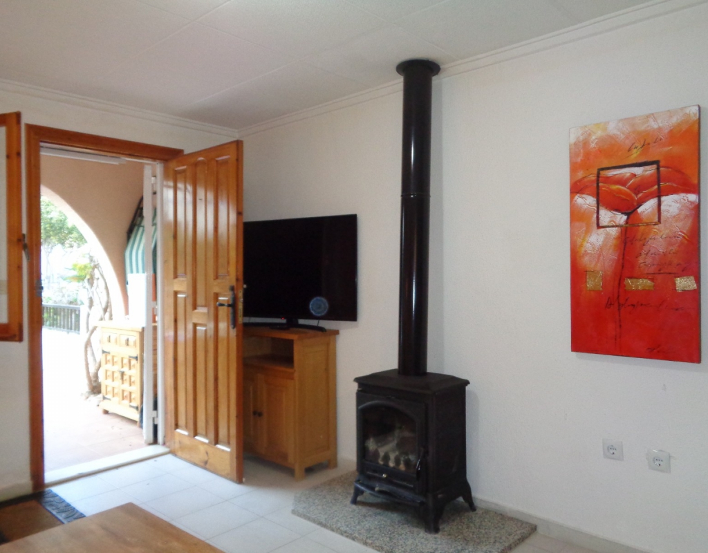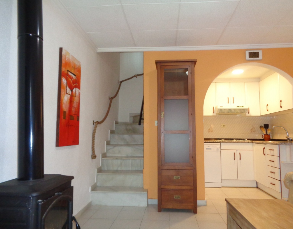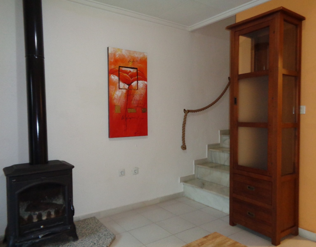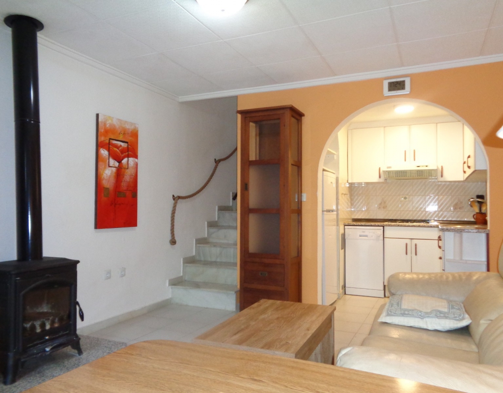 Here we have a cozy west facing bungalow for sale in Urbanisaton Buenavista, Guardanar for sale. The property has a constructed area of around 46 m² and on the lower leverl you will find outside a spacious terrace and porch, inside there is a lving room with log burning fire and an open plan kitchen. The marble staircase leads you to the upper floor where you will find a storage room, the modernised bathroom and the bedroom with access to the balcony.