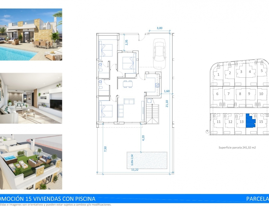 The prices includes a swimming pool of 6 m x 2.5 m, 1.5 kW of free electricity generated by 3 photovoltaic solar panels, installed air conditioning, fully furnished bathrooms with shower screens, electric blinds, 150-litre water heater, laundry room, ventilation system, osmosis in the kitchen, etc., and built to energy certification and private parking.